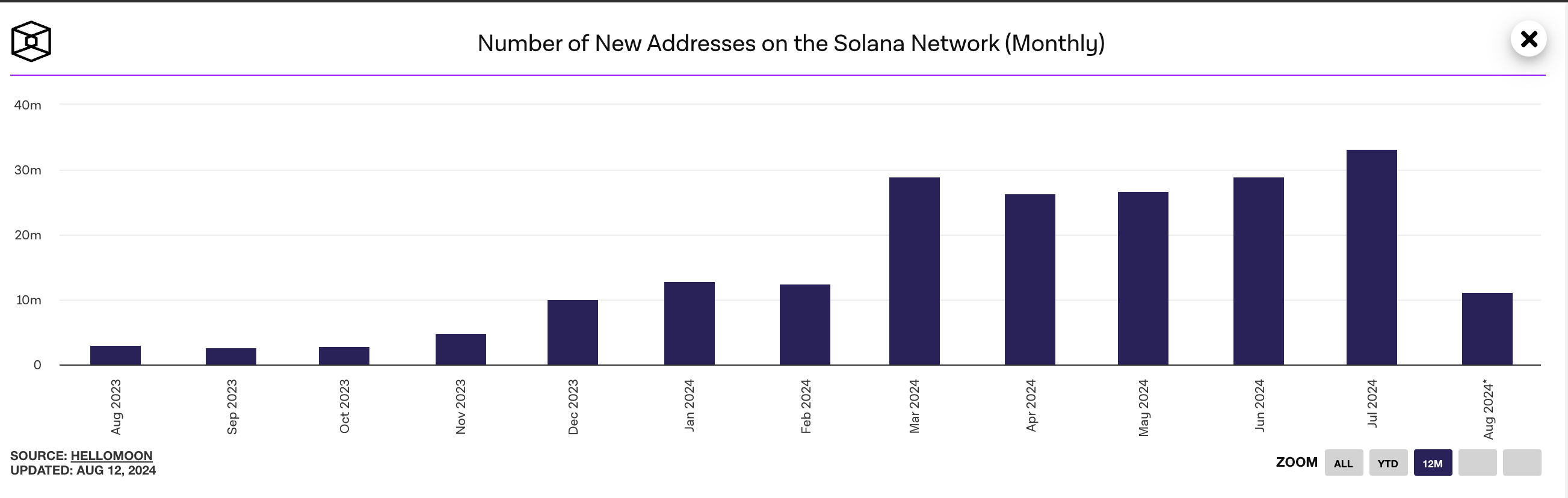Tot nu toe deze maand heeft het aantal unieke adressen dat transacties op Solana heeft ondertekend, 18,09 miljoen bedragen. Dit is een daling van 67% ten opzichte van de 54,33 miljoen maandelijks actieve gebruikers die in juli zijn geregistreerd en een daling van 16% in actief gebruik year-to-date (YTD).
