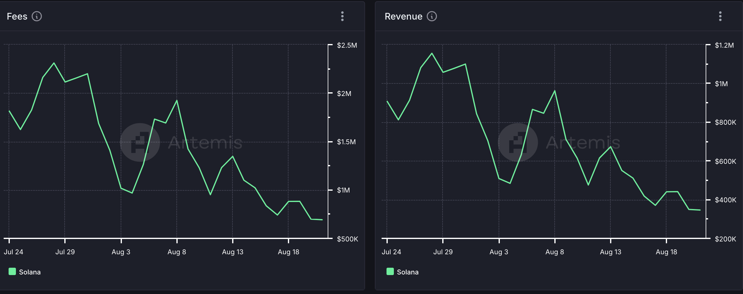 Met verminderde activiteit op Solana deze maand, zijn netwerkkosten en inkomsten die daaruit voortkomen beïnvloed. Artemis’ data toont aan dat deze met 62% zijn gedaald in de afgelopen 30 dagen.