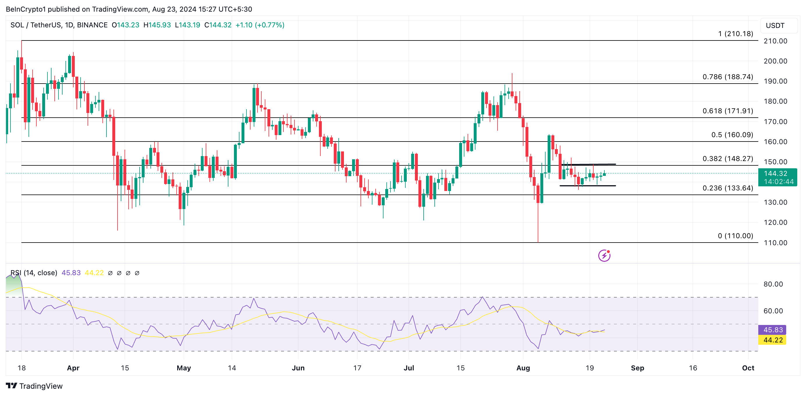 Op dit moment handelt SOL voor $145,58. Sinds 12 augustus heeft de coin zijwaarts bewogen, met weerstand op $152,12 en steun op $137,65.