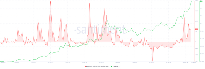 Het momentum dat zich in de markt opbouwt, stemt echter overeen met de beloningen. Investeerders zijn optimistisch over verdere winsten, zoals te zien is op de grafiek. De gewogen sentimentindicator piekt wanneer het sociale volume high is, en de overgrote meerderheid van de berichten in de indicator zijn tegelijkertijd zeer positief.