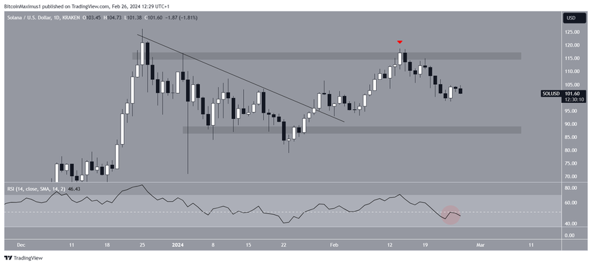 De technische analyse van het dagelijkse tijdsframe laat zien dat de koers van SOL op 28 januari 2024 uitbrak uit een dalende weerstandstrendlijn. De opwaartse beweging bereikte een hoogtepunt van $119 op 14 februari.