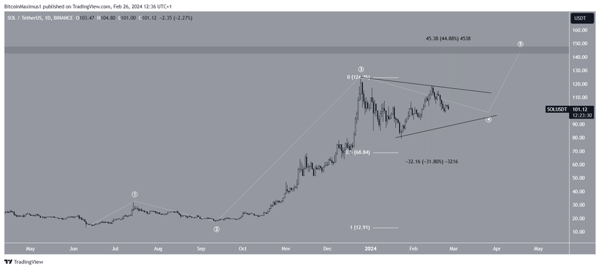 Een SOL breakout uit de driehoek zal bevestigen dat wave vijf is begonnen. Als dat zo is, kan SOL met 45% stijgen naar de volgende weerstand op $145.