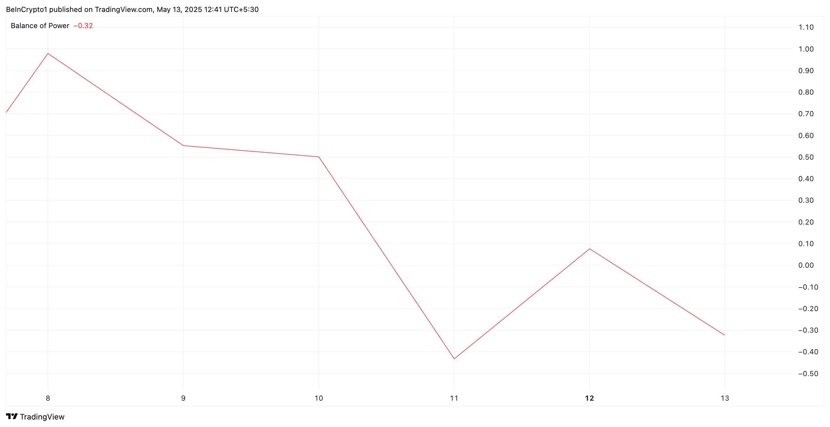 De BoP-indicator meet de sterkte van koop- versus verkoopdruk in de koersactie van een crypto. Wanneer deze negatief is, signaleert het dat verkopers momenteel domineren de markt, wat wijst op verhoogde winstneming of bearish momentum.