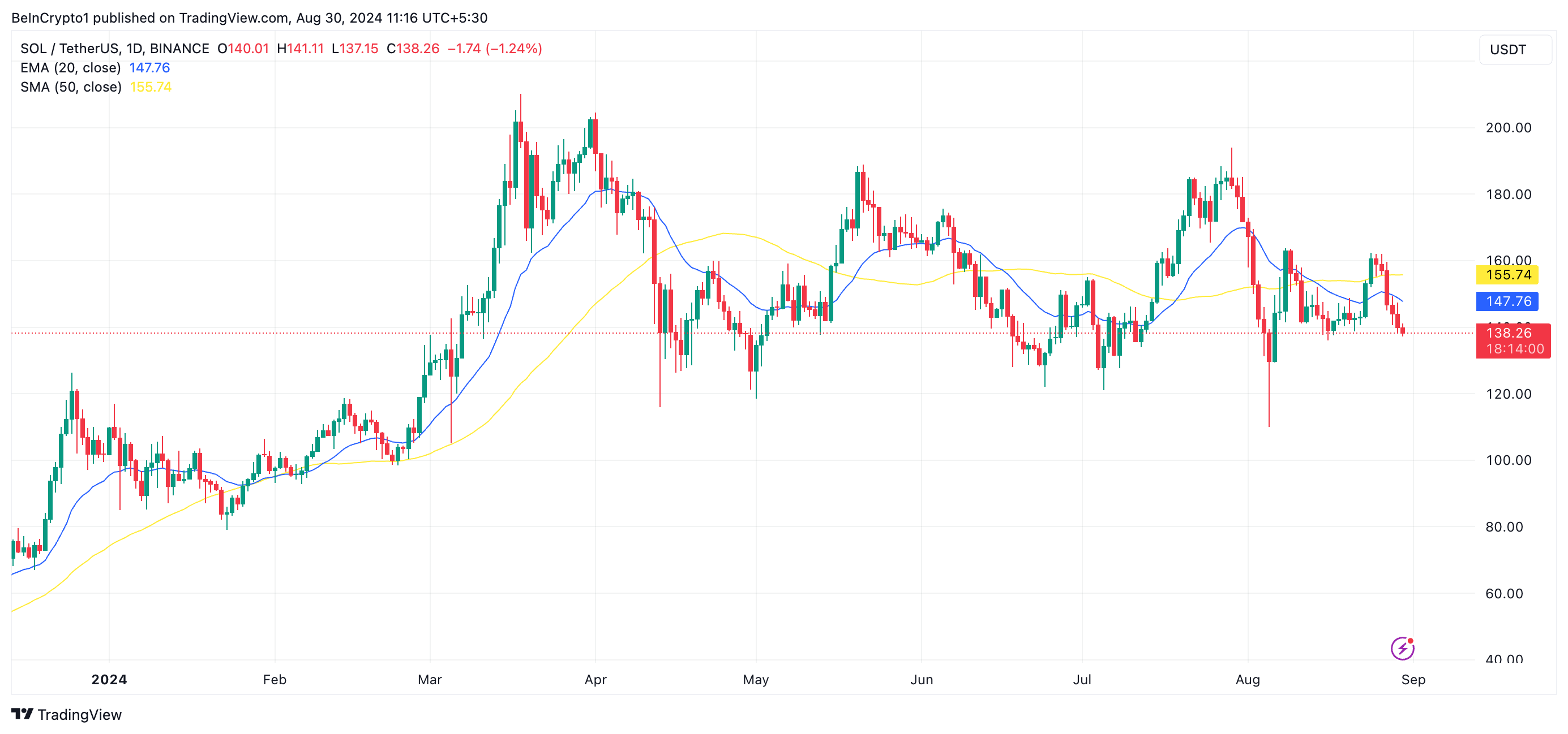 Recente metingen van de eendaagse grafiek van Solana (SOL) onthullen dat zijn koers op 27 augustus onder zowel de 20-daagse exponential moving average (EMA) als de 50-daagse simple moving average (SMA) viel, na een mislukte poging om erboven te stabiliseren. Momenteel staat de 20-daagse EMA van SOL op $147,72 en zijn 50-daagse SMA op $155,74, terwijl de coin zelf handelt op $137,86.
