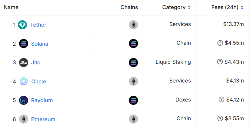 In de laatste 24 uur heeft Raydium $4,12 miljoen aan opbrengsten verzameld, meer dan Ethereum, dat $3,55 miljoen verzamelde. Dit niveau van activiteit weerspiegelt de groeiende populariteit van Raydium onder DeFi-gebruikers. De hogere fee-inkomsten kunnen wijzen op een bullish sentiment, aangezien handelaren efficiënte, snelle platforms zoeken. Deze toename in activiteit kan mogelijk leiden tot opwaartse druk op het RAY token, wat investeerders nauwlettend in de gaten houden.