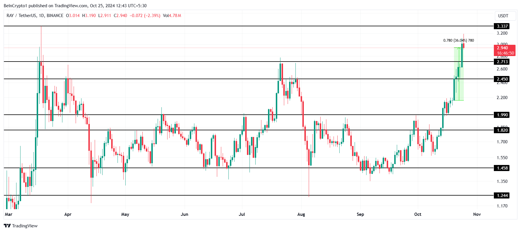 De RAY koers steeg deze week met 36%, handelend op $2,94 en bereikte een 7-maandse high, wat optimisme wekt voor kortetermijngroei.