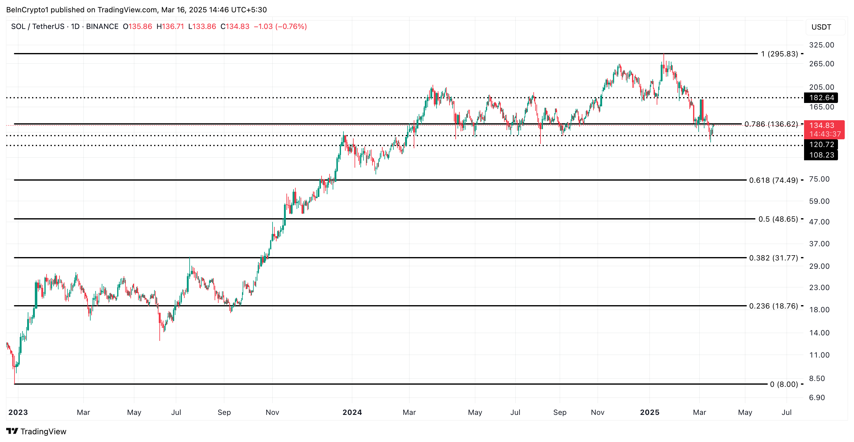 Op het moment van pers, handelt SOL op $134,67, net boven de steun gevormd op $120,72. Als de bearish druk toeneemt, kan de koers van de coin onder dit niveau dalen. In dat geval kan extra verkoopdruk worden uitgelokt, waardoor de koers van SOL kan dalen naar $108,23.