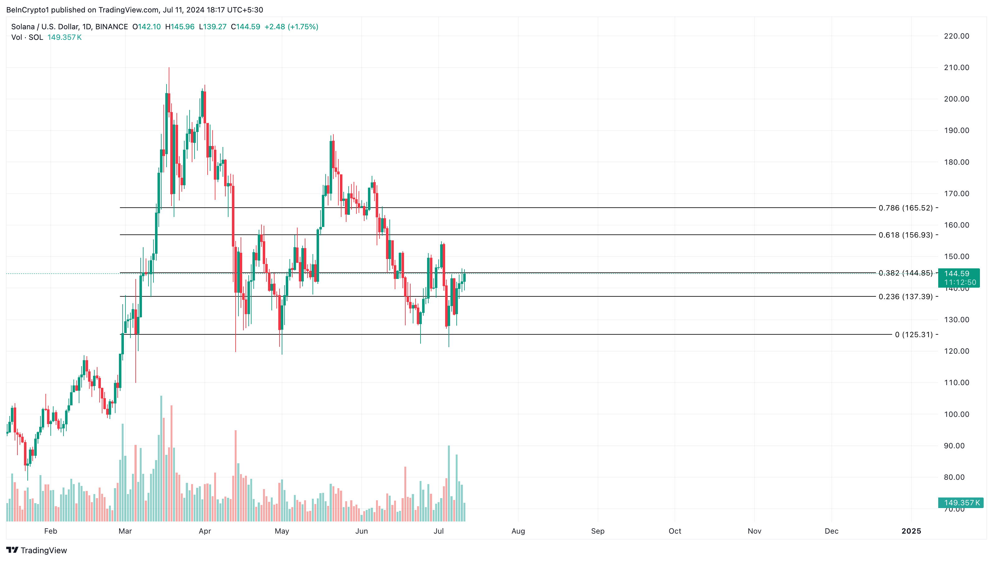 Daarnaast gebruikt BeInCrypto de Fibaonccil Retracement-indicator om niveaus te spotten die SOL binnenkort zou kunnen bereiken. De belangrijkste getallen in deze reeks zijn 23,6%, 38,2%, 61,8% en 76,8%.