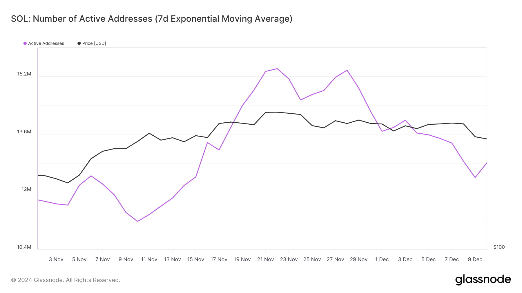 Solana’s actieve adressen, een belangrijke indicator van gebruikersbetrokkenheid, zijn gedaald tot het laagste punt in december, wat de zorgen over afnemende interesse verder versterkt. Lagere activiteitsniveaus correleren vaak met verminderde liquiditeit, wat de koersvolatiliteit kan verergeren en verdere adoptie kan belemmeren. Deze daling in actieve adressen roept red flags op voor handelaren en investeerders, wat aangeeft dat Solana moeite kan hebben om het niveau van vraag te trekken dat het ooit had.