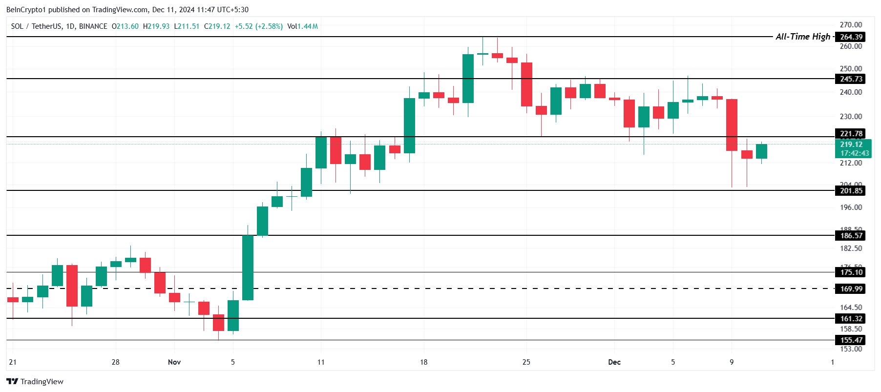 Een succesvolle doorbraak van $221 zou Solana’s koers naar $245 kunnen stuwen. Dit zou de bearish verwachting ongeldig maken, wat wijst op een sterker marktsentiment. Het zou de cryptomunt dichter bij zijn all-time high van $264 brengen. Een aanhoudende beweging boven $221 is cruciaal voor SOL om opwaarts momentum te herwinnen en eerdere koersrecords uit te dagen.