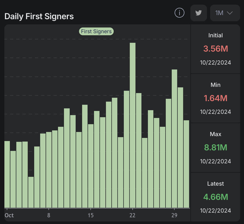 Gedurende de beoordelingsperiode zag Solana ook een toestroom van nieuwe gebruikers. On-chain data toont aan dat het totale aantal unieke eerste ondertekenaars die transacties uitvoerden op het Solana-netwerk 148 miljoen bedroeg in oktober — het hoogste aantal dit jaar en een stijging van 32% ten opzichte van de 100 miljoen nieuwe gebruikers in september.