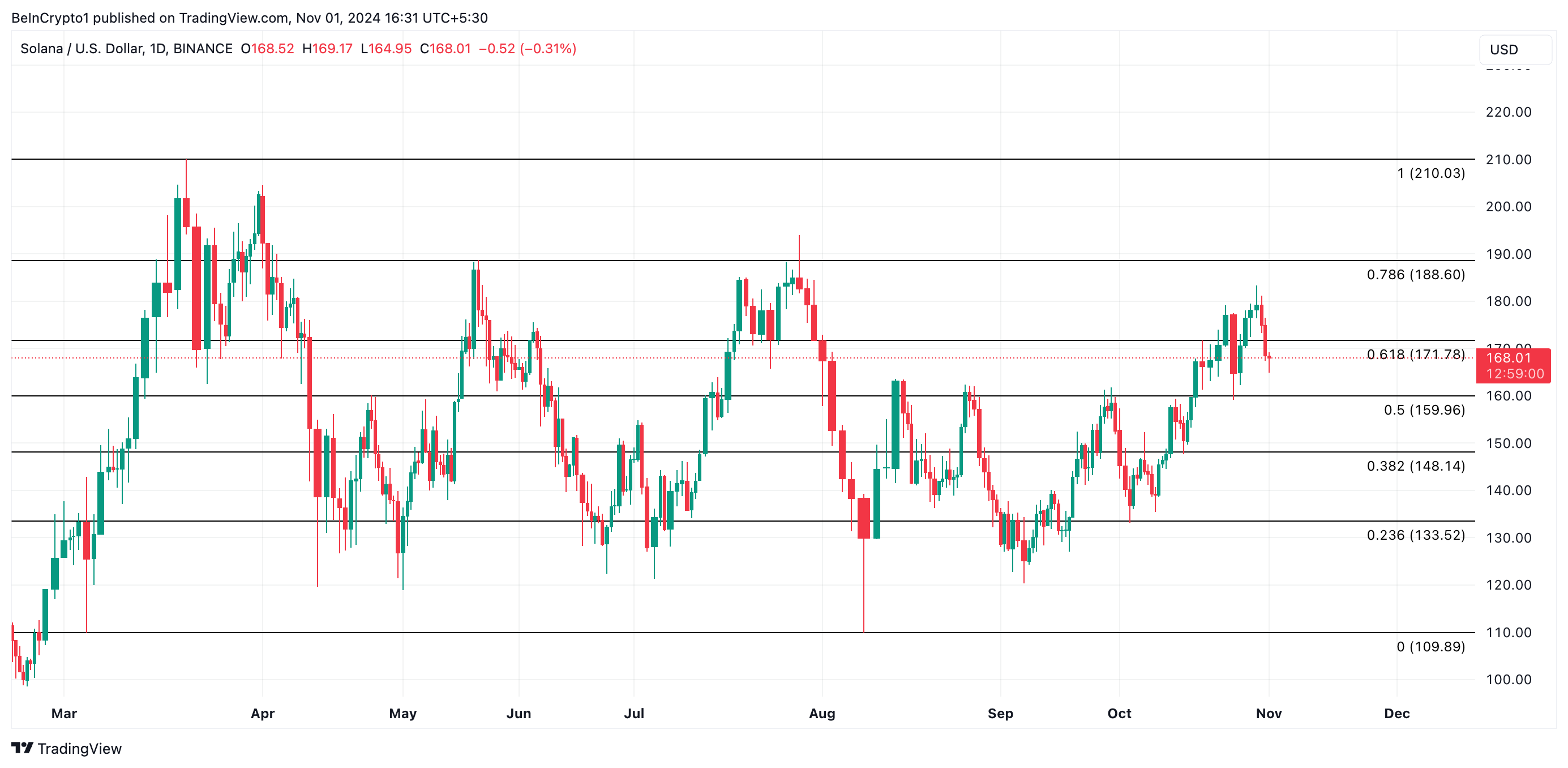 SOL wordt momenteel verhandeld voor $168,01, wat een daling van 4% weergeeft over de afgelopen 24 uur. Ondertussen duidt een stijging van 6% in handelsvolume op verhoogde verkoopactiviteit in de markt.