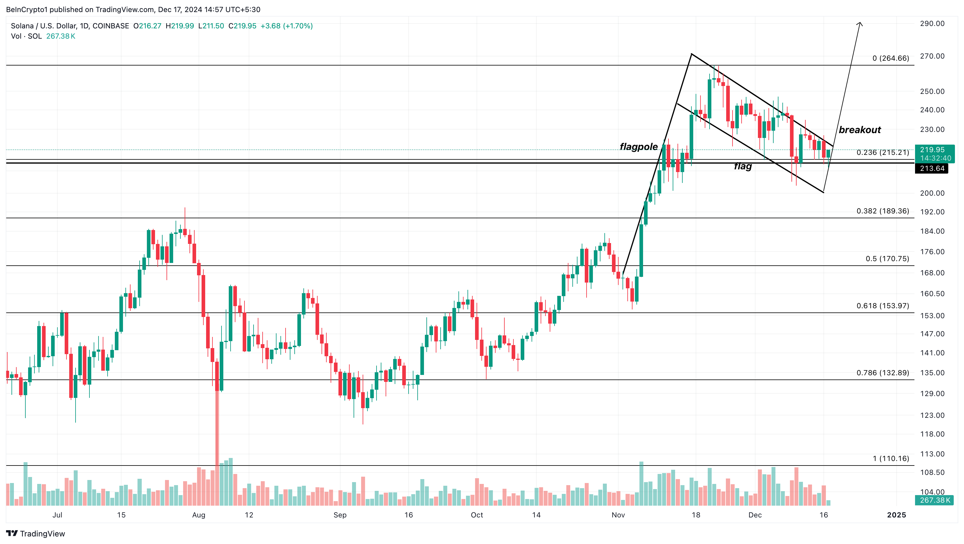 De vlagformatie bracht aanvankelijk de SOL koers naar $213,64. Echter, de koers is sindsdien hersteld en handelt momenteel op $219,95. Als Solana boven de bovenste trendlijn van de vlag stijgt, kan de waarde $290 bereiken voordat 2024 eindigt.
