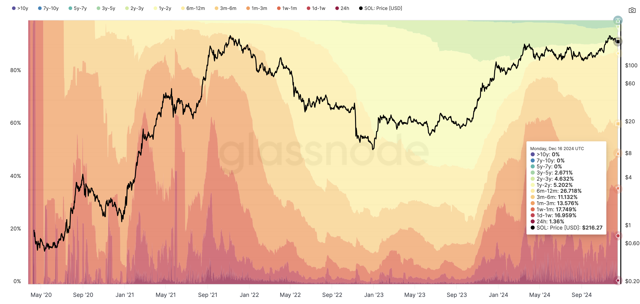 Volgens Glassnode vond de meerderheid van de SOL accumulatie dit jaar plaats, waarbij investeerders 26% van de totale voorraad in de 6 tot 12-maandse categorie bezitten. De 3 tot 6-maandse groep bezit 13%, terwijl de 1 tot 3-maandse groep 11% voor hun rekening neemt.