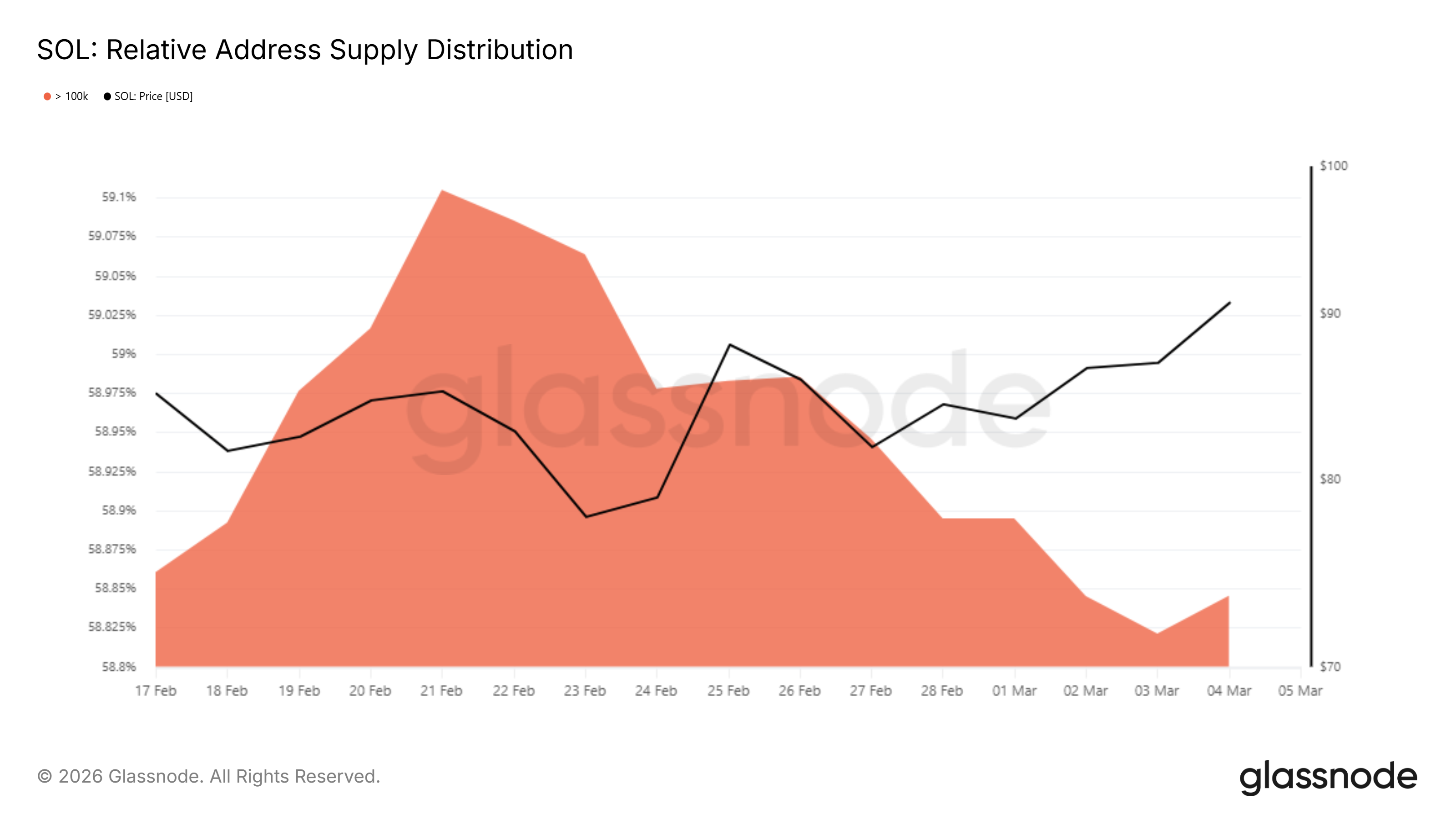 Op macro-niveau verandert er ook iets in de verdeling van SOL-tokens. Het aandeel van whales met meer dan 100.000 SOL is licht gedaald. In de afgelopen twee weken ging hun percentage van het totaal van 59% naar 58,6%. Dat betekent dat deze grote houders tijdens de recente stijging wat SOL hebben verkocht. Dit kan duiden op enige terughoudendheid onder de grootste investeerders.