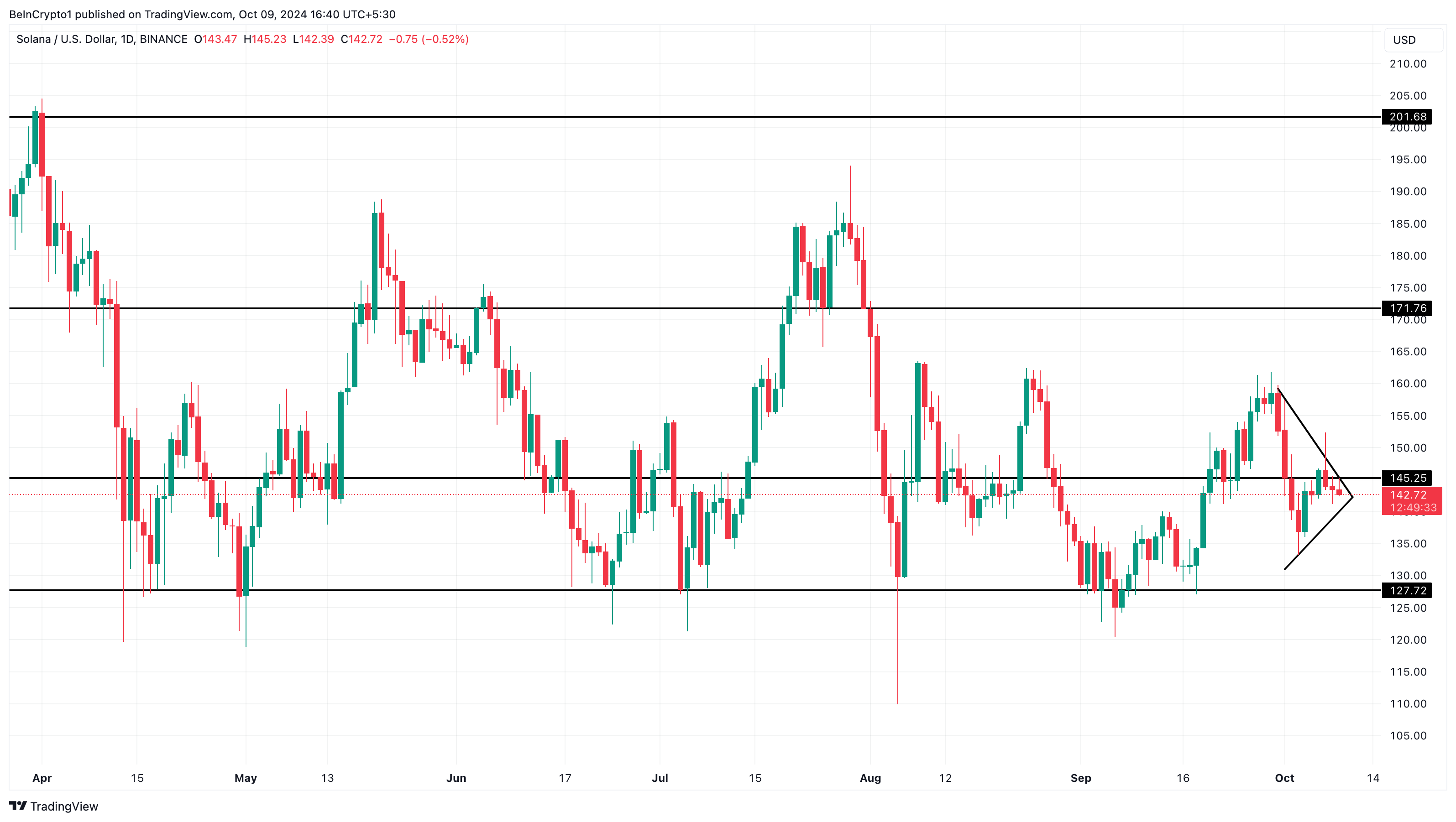 Een blik op de dagelijkse grafiek van Solana onthult dat de koers op het punt staat uit te breken uit een symmetrisch driehoekspatroon, gevormd door convergerende dalende en stijgende trendlijnen met gelijke hellingen.