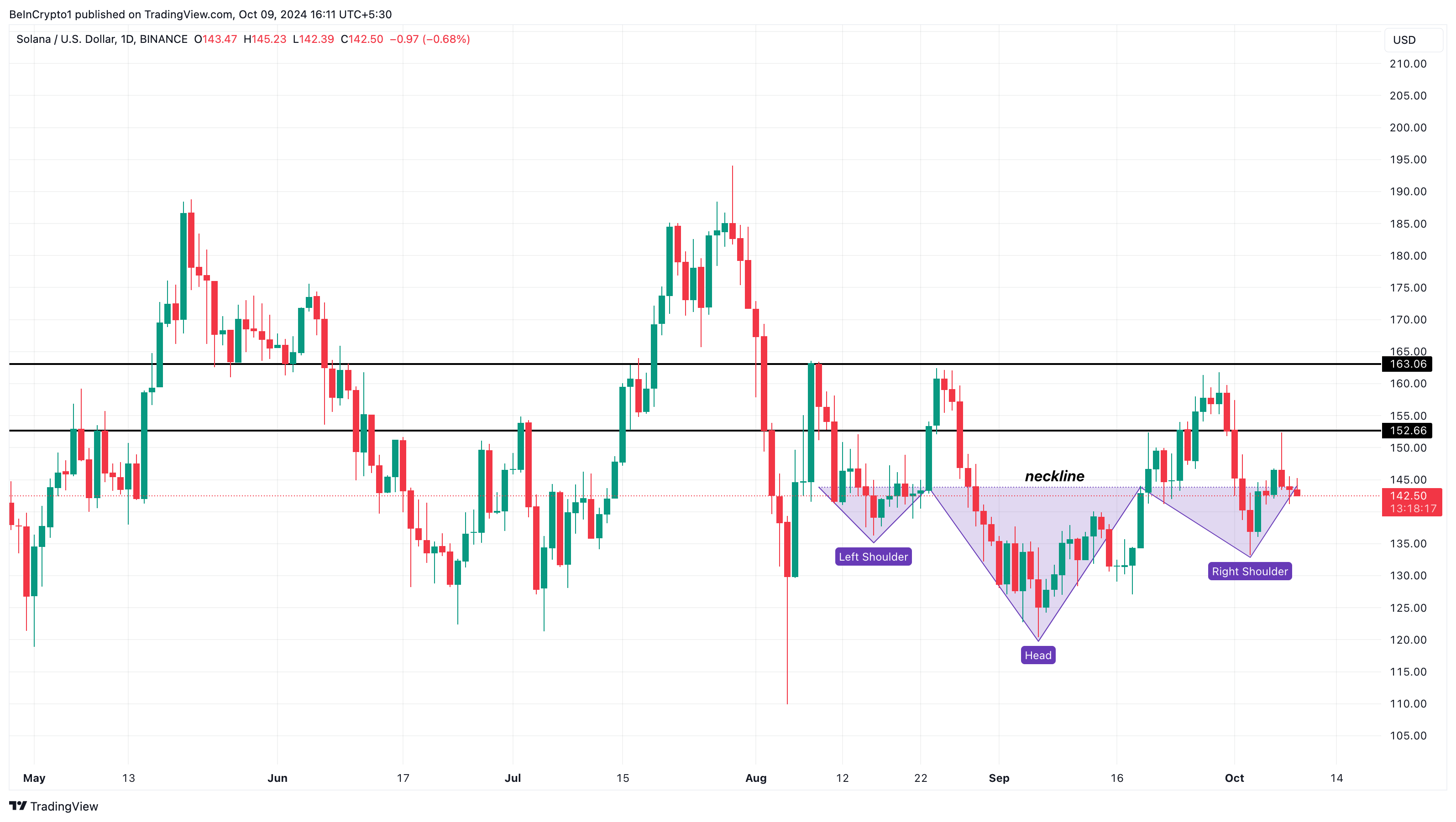 Om deze verwachting te bevestigen, moet de Solana koers boven de neklijn rond $145 komen. Zodra dat gebeurt en de koopdruk toeneemt, kan de altcoin de weerstandsniveaus op $152,66 en $163,06 doorbreken.