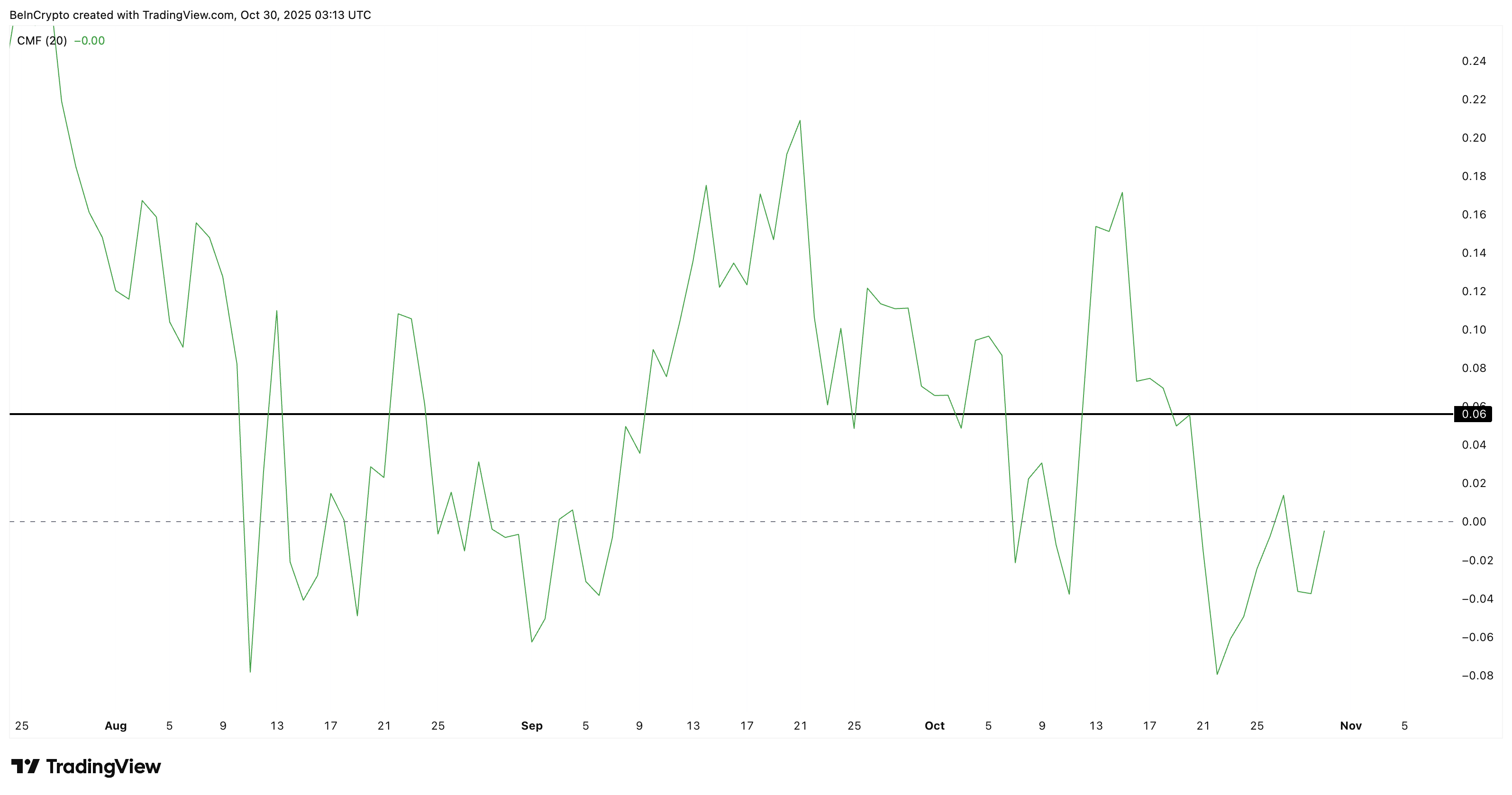 De Chaikin Money Flow (CMF) — een tool die instromen en uitstromen van groot geld meet — versterkt dit beeld. Na op 27 oktober kort boven nul te zijn gestegen, werd de CMF weer negatief en sindsdien is er geen herstel. Dat betekent dat institutionele kopers niet agressief toevoegen, zelfs niet na recente dips.
