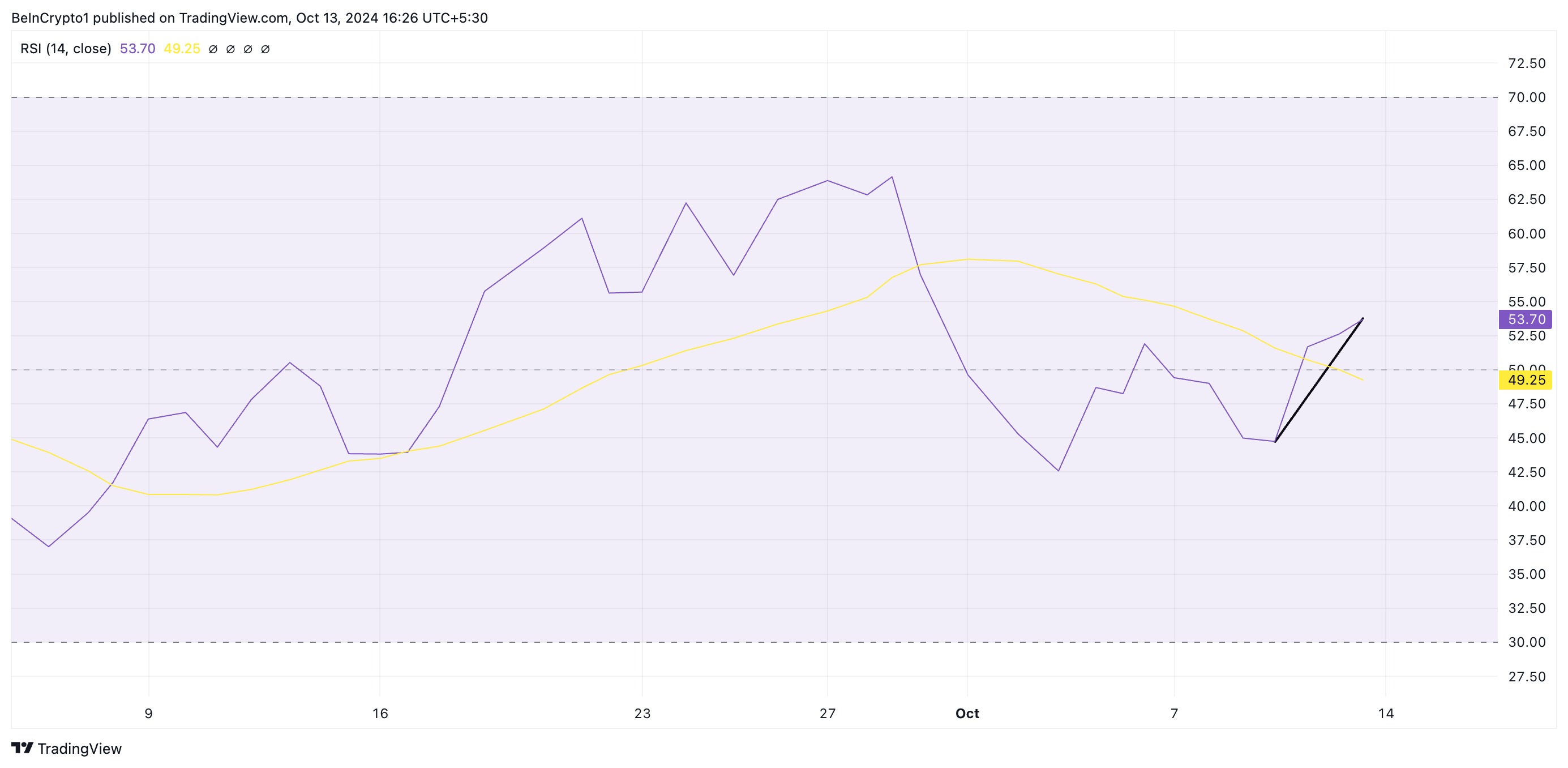 De Relative Strength Index (RSI) van Solana is in een opwaartse trend op 53,93 op het moment van schrijven. Deze indicator meet de oversold en overbought-marktcondities van de coin.