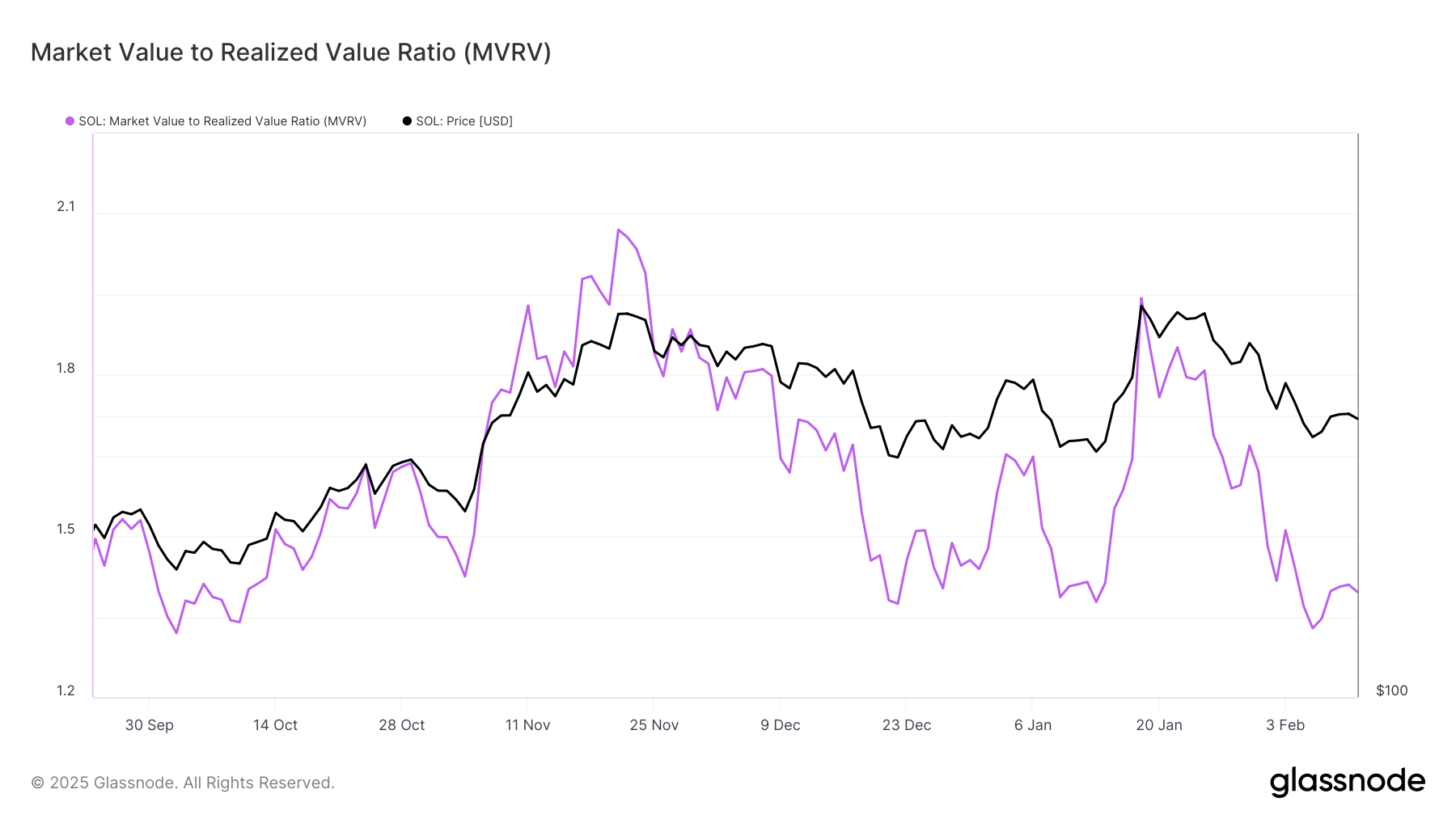 De Market Value to Realized Value (MVRV) ratio voor Solana staat momenteel op 1,40, een niveau dat historisch gezien een voorbode is van koersstijgingen. Deze lage MVRV geeft aan dat de crypto niet overgewaardeerd is, wat cruciaal is voor het behoud van markstabiliteit. De lagere waardering helpt de verkoopdruk in toom te houden, wat een kans op herstel biedt.