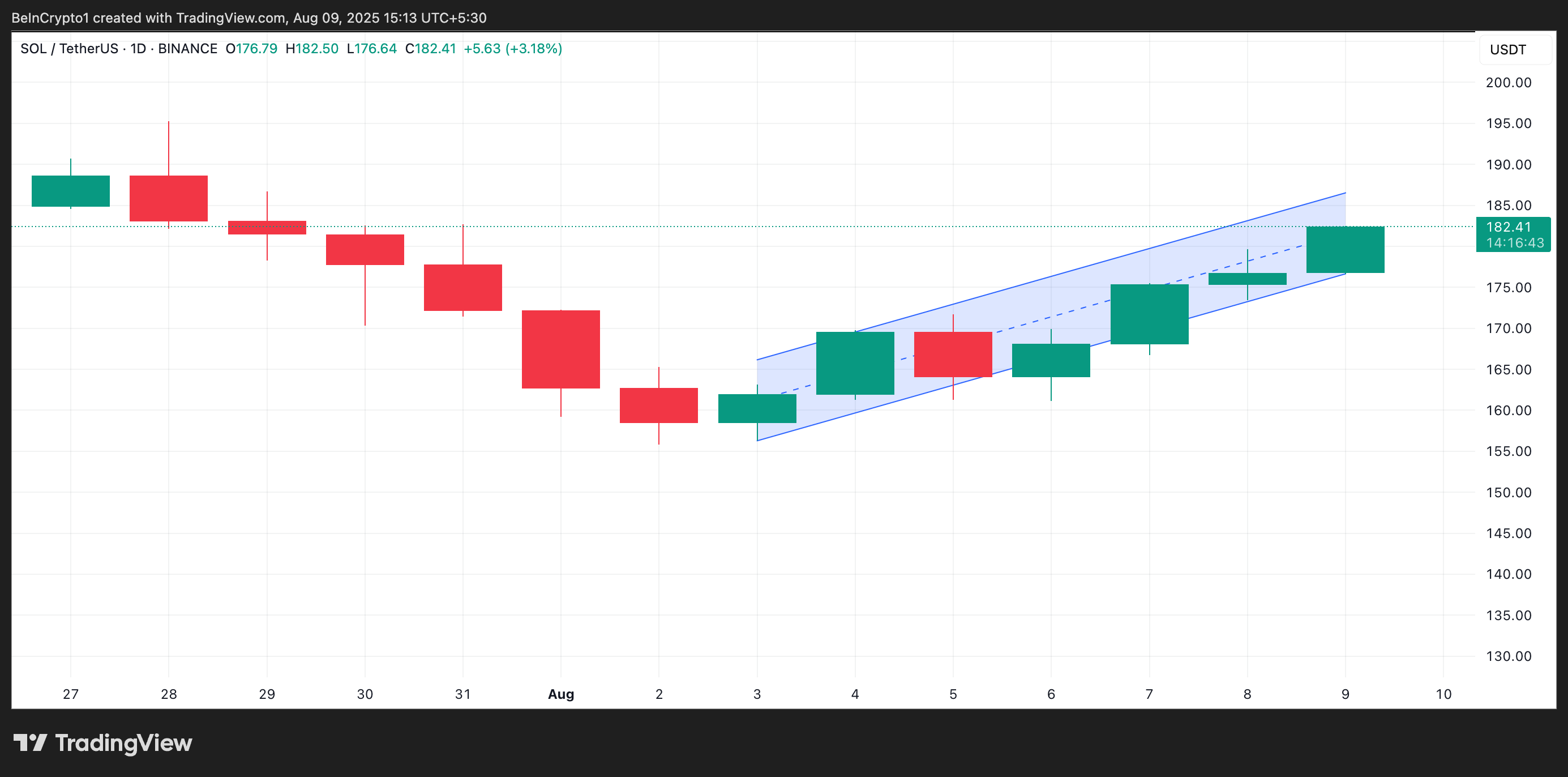 Op het moment van schrijven wordt SOL verhandeld voor $181,82, net onder het weerstandsniveau van $186,52, de bovenste grens van zijn stijgende parallel kanaal.