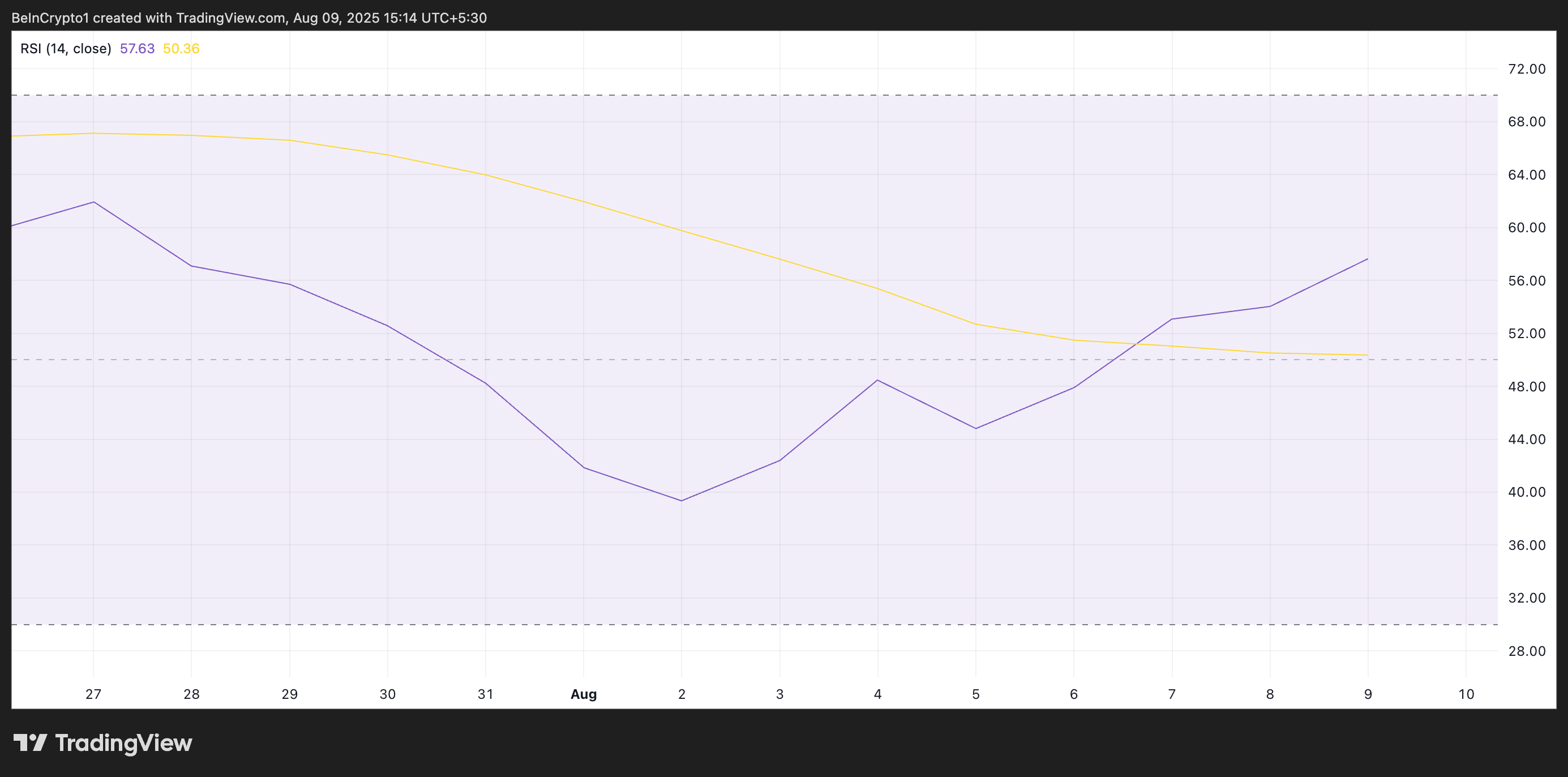 De RSI-indicator meet de overbought- en oversold-marktomstandigheden van een asset. Het varieert tussen 0 en 100. Waarden boven 70 suggereren dat de crypto overbought is en een koersdaling te wachten staat, terwijl waarden onder 30 aangeven dat de coin oversold is en mogelijk een herstel kan zien.