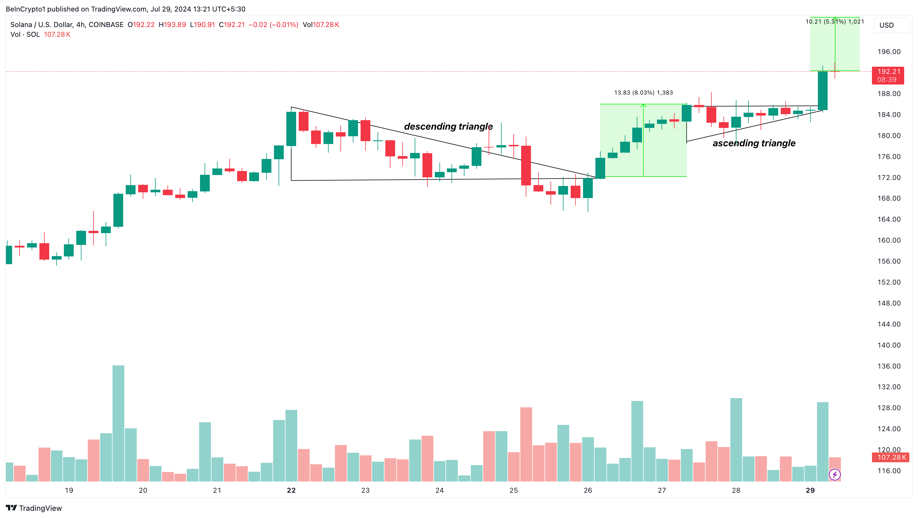 Wanneer de koers echter uit dit patroon breekt, verschijnt er een opmerkelijke opleving, waardoor SOL eerder $186 bereikte. Na een lichte daling verscheen er een stijgende driehoek om het bullish sentiment te valideren.