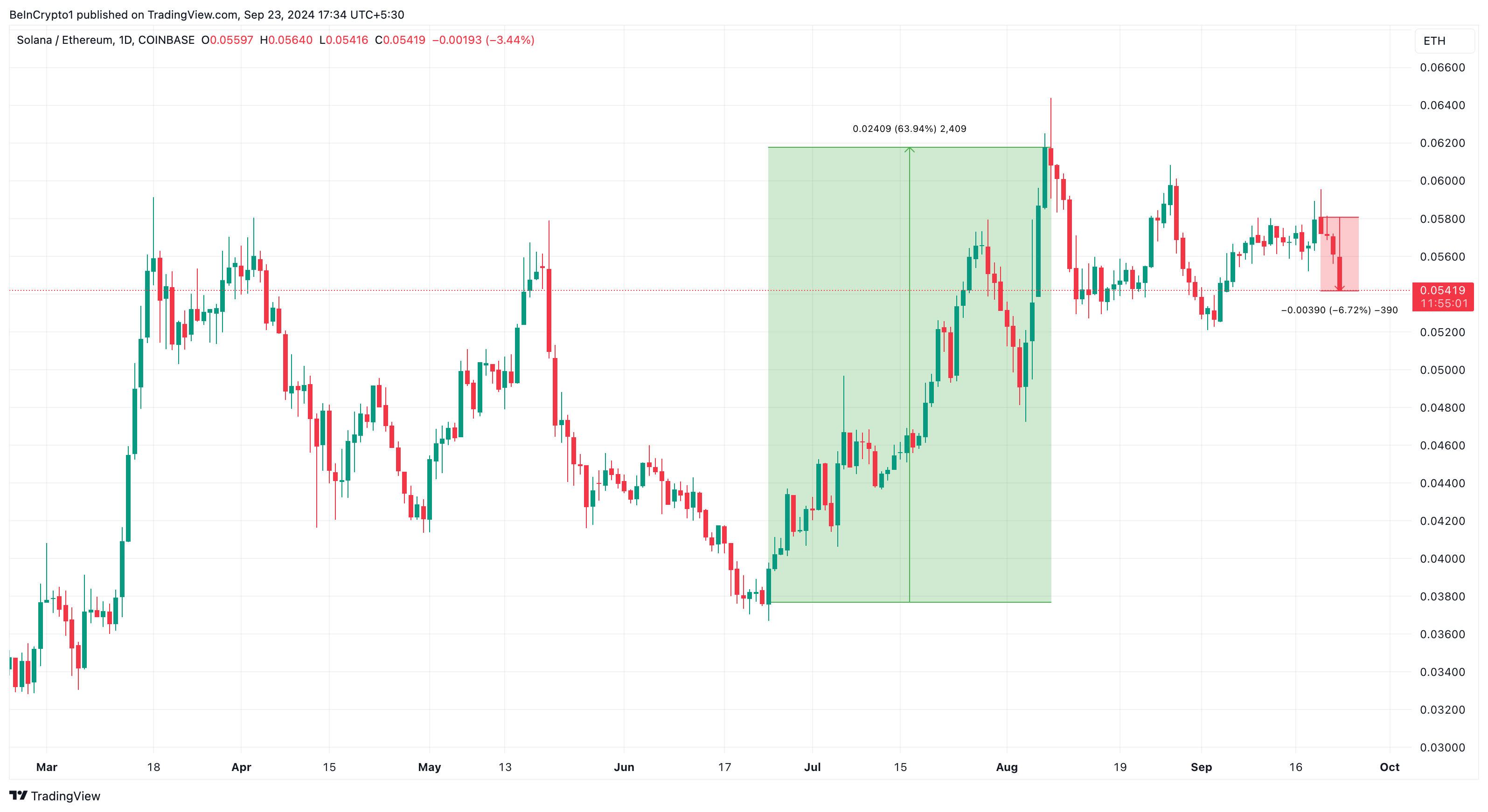 Een andere indicator die de voorzichtige benadering ondersteunt, is het SOL/ETH-paar, dat de koers van Solana in verhouding tot Ethereum vergelijkt. Wanneer het SOL/ETH-paar stijgt, betekent dit dat Solana beter presteert dan Ethereum. Echter, een daling duidt erop dat Ethereum momenteel beter presteert dan Solana.