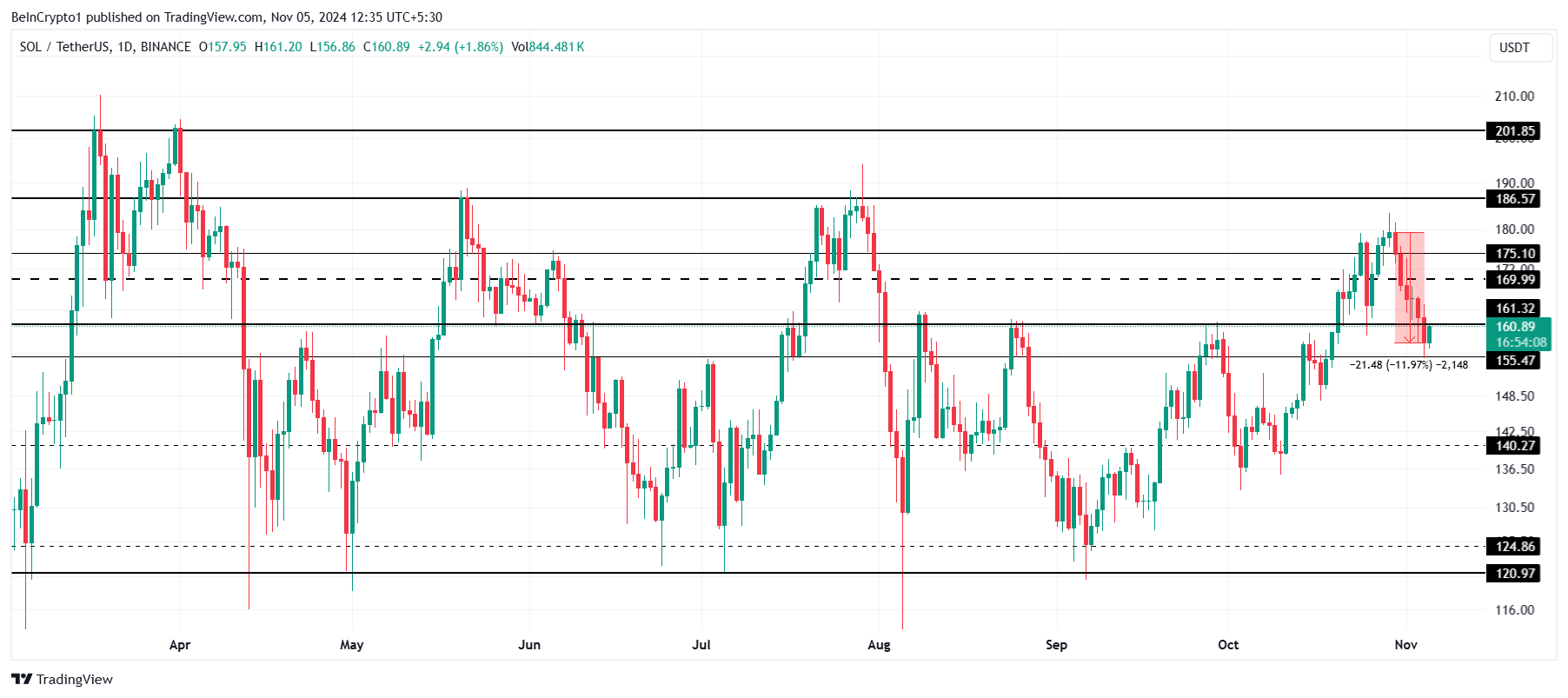 Solana is de afgelopen week met 12% gedaald, handelend op $160 en zwevend net onder het belangrijke weerstandsniveau op $161. Het omzetten van deze weerstand in een steunniveau is essentieel voor SOL om een herstel richting $186 te proberen. Als het lukt om $161 als steun veilig te stellen, zou dit Solana de basis kunnen bieden die nodig is voor meer winsten.