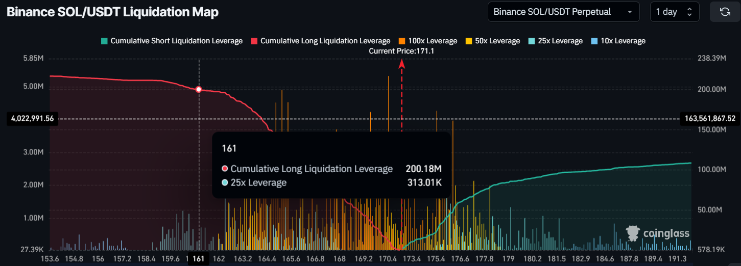 Momenteel toont de liquidatiekaart dat Solana-handelaren bullish zijn, met een hoger aantal longcontracten vergeleken met shortposities. Hoewel dit vertrouwen weerspiegelt in de opwaartse traject van Solana, vormt het ook een significant risico als de markt draait. Als de koers van Solana corrigeert en daalt naar het $161 steunniveau, kunnen meer dan $200 miljoen aan longcontracten worden geliquideerd. Deze zware liquidatie zou de marktsentiment beïnvloeden en mogelijk meer verkoop uitlokken, wat de prijsdaling verergert.