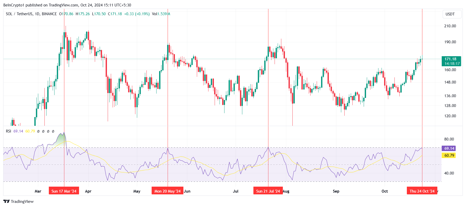 Vanuit technisch perspectief bevindt het macro-momentum van Solana zich op een cruciaal punt. De Relative Strength Index (RSI) nadert de overbought zone, wat typisch een mogelijke omkering aangeeft. Historisch gezien, wanneer Solana deze niveaus bereikte, ondervond de markt significante terugvallen. Als de RSI de overbought zone binnengaat, kan dit een terugval triggeren die SOL naar het $161 steunniveau stuurt.