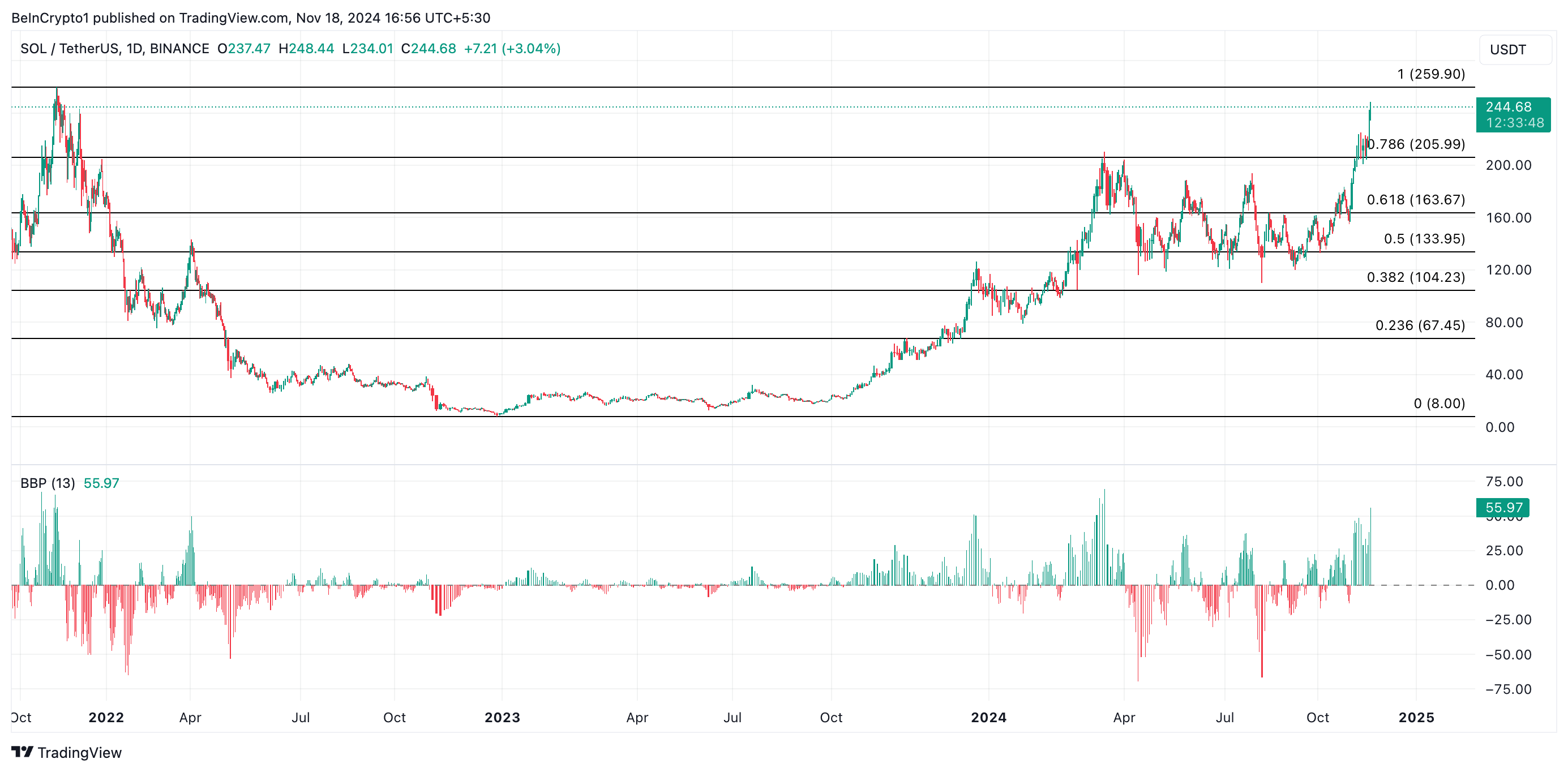 Deze verhoogde activiteit op het Solana-netwerk heeft zijn native token, SOL, gepositioneerd om mogelijk zijn all-time high van $260 te heroveren. Op dit moment handelt SOL op $244,68, 6% verwijderd van deze koerspiek.