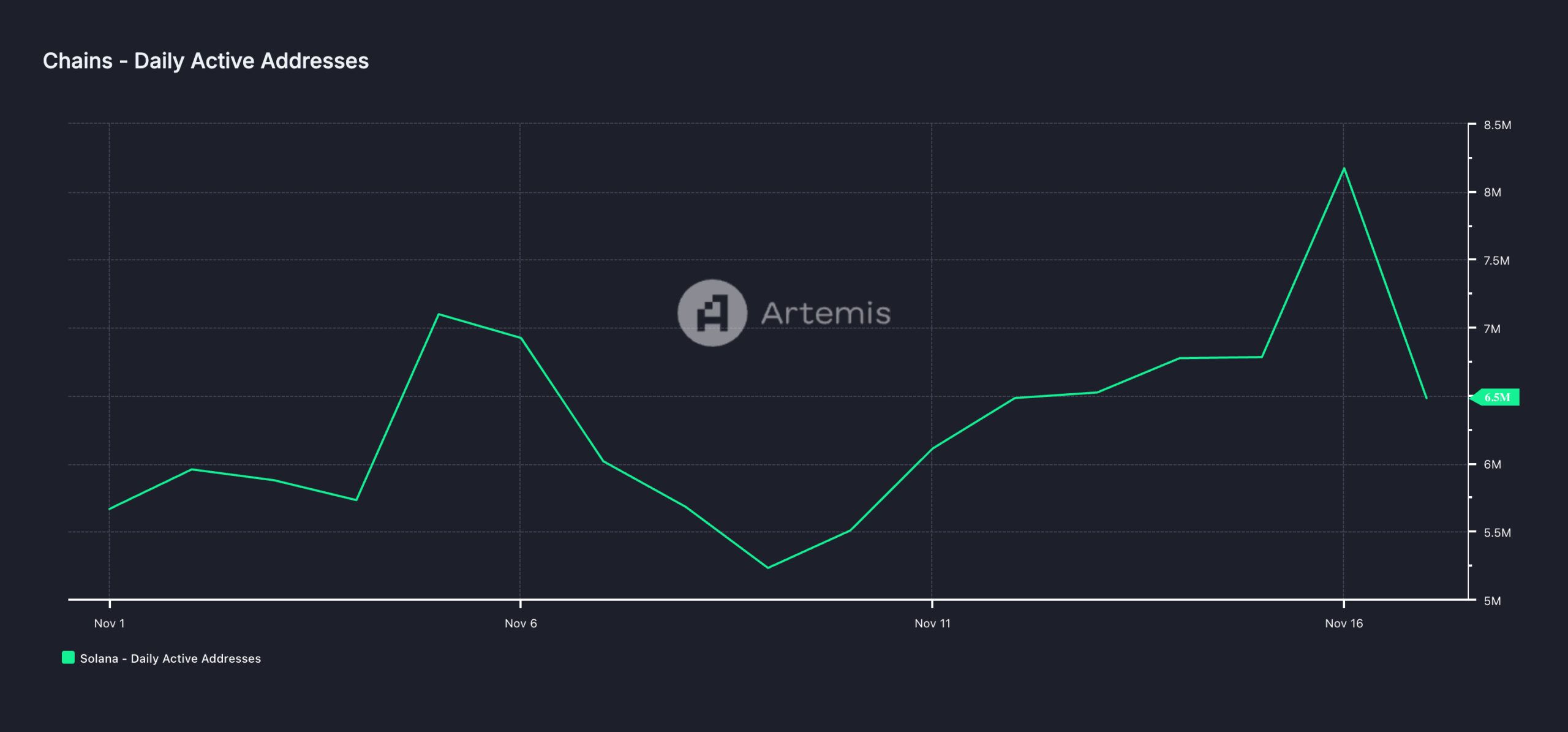 De groeiende handelsactiviteit rond deze tokens en andere kleinere-cap memecoins heeft geleid tot een aanzienlijke toename in gebruikersvraag op het Solana-netwerk. Volgens Artemis heeft het aantal actieve adressen dat ten minste één transactie op de L1 heeft voltooid, 6 miljoen bereikt month-to-date, wat een stijging van 14% betekent.