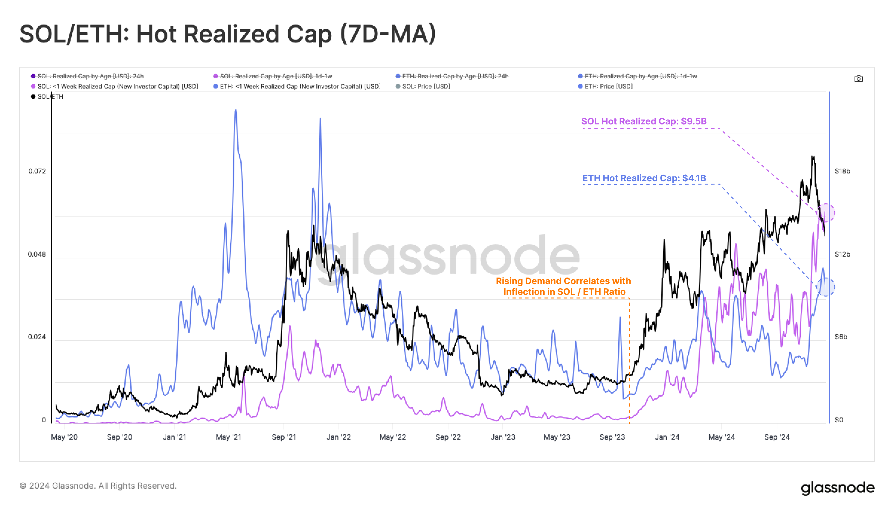 De vraag naar Solana overtreft die van Ethereum, zoals blijkt uit de Hot Realized Cap metriek. Volgens een rapport van Glassnode bereikte de Hot Realized Cap van SOL deze week $9,5 miljard, meer dan het dubbele van Ethereum’s $4,1 miljard. Dit duidt op aanhoudende investeerdersinteresse en verhoogde activiteit binnen het Solana-netwerk.