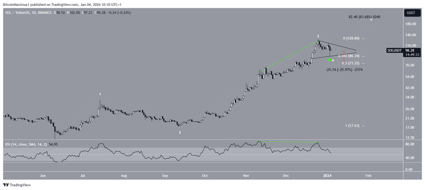 Ondanks deze bullish verwachting van de SOL koers, kan een uitbraak uit de driehoek een 26% daling triggeren naar het 0.5 Fib retracement steunniveau op $73, wat wave vier zou voltooien.