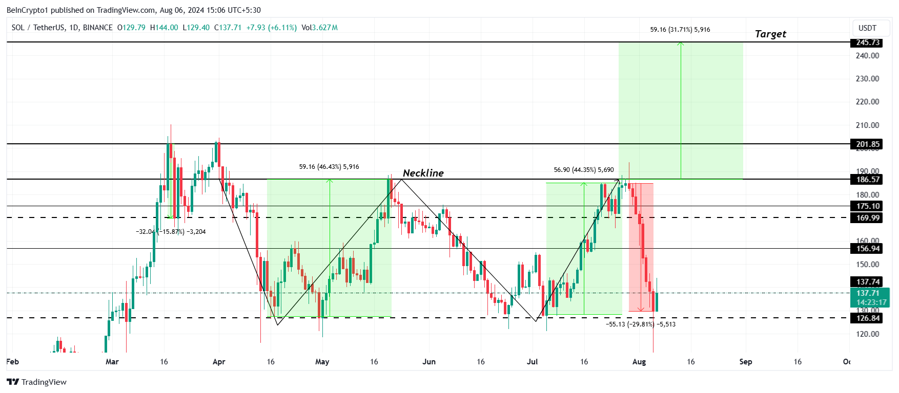 De Solana koers wiste de recente 44% winsten en maakte ook het bullish double-bottom patroon volledig ongeldig. Het patroon had een potentiële rally van 31% gesuggereerd die SOL naar $245 had kunnen sturen.