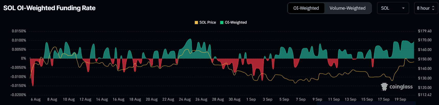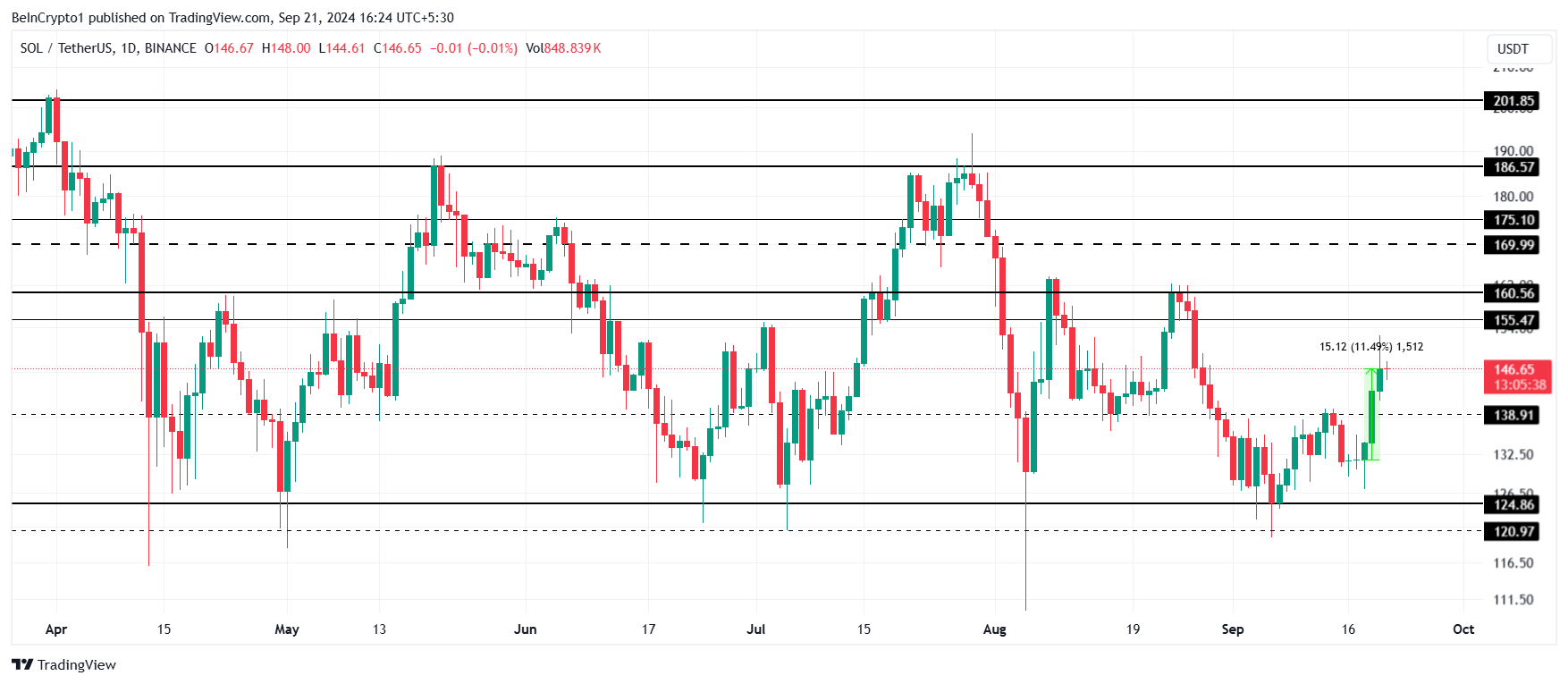 De Solana koers is de afgelopen drie dagen met 11,5% gestegen, waardoor de cryptomunt zich positioneert om het $160-weerstandsniveau te testen. Deze barrière heeft SOL sinds augustus verhinderd om uit te breken, maar de recente koersactie suggereert dat Solana het momentum kan hebben om het te doorbreken.