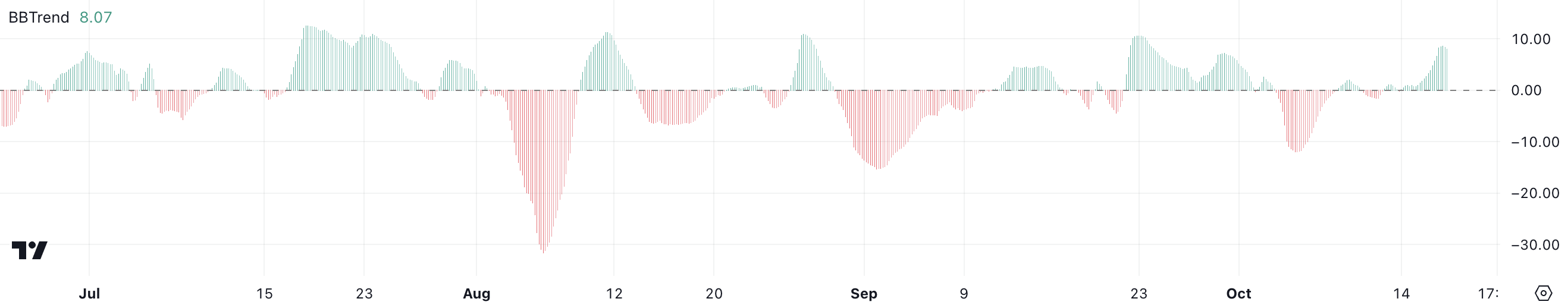 De BBTrend-metriek meet de kracht en richting van de trend met behulp van Bollinger Bands, die de volatiliteit volgen. Hoewel de huidige BBTrend-waarde positief blijft, is deze gedaald van 9,01 de afgelopen dagen, wat suggereert dat het bullish momentum van Solana mogelijk afneemt.