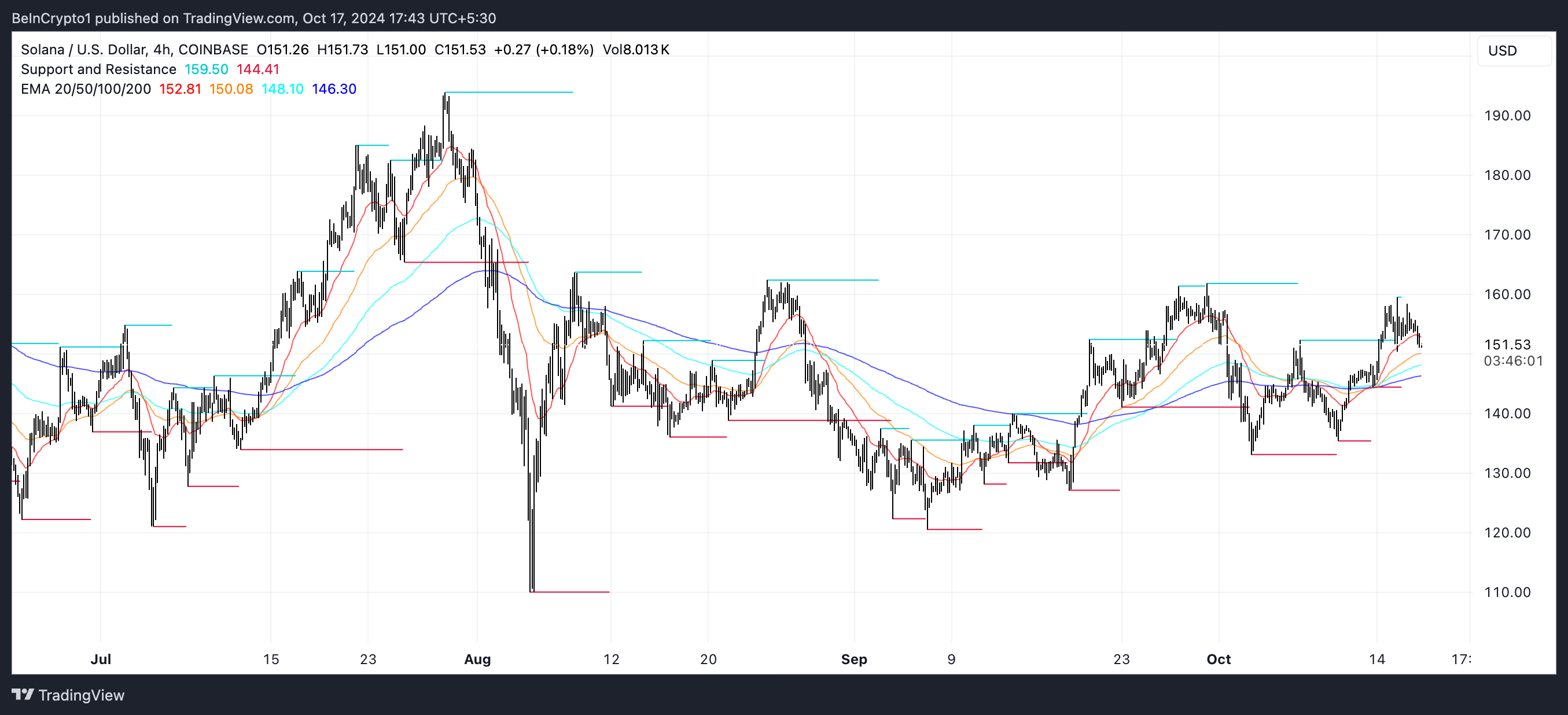 De EMA-lijnen van SOL blijven bullish, met de korte-termijn exponentiële moving averages (EMA’s) boven de lange-termijn EMA’s gepositioneerd. Deze opstelling suggereert dat de koerstrend zich momenteel in een opwaartse fase bevindt, waarbij de recente koersbewegingen de langere-termijn gemiddelden overtreffen.