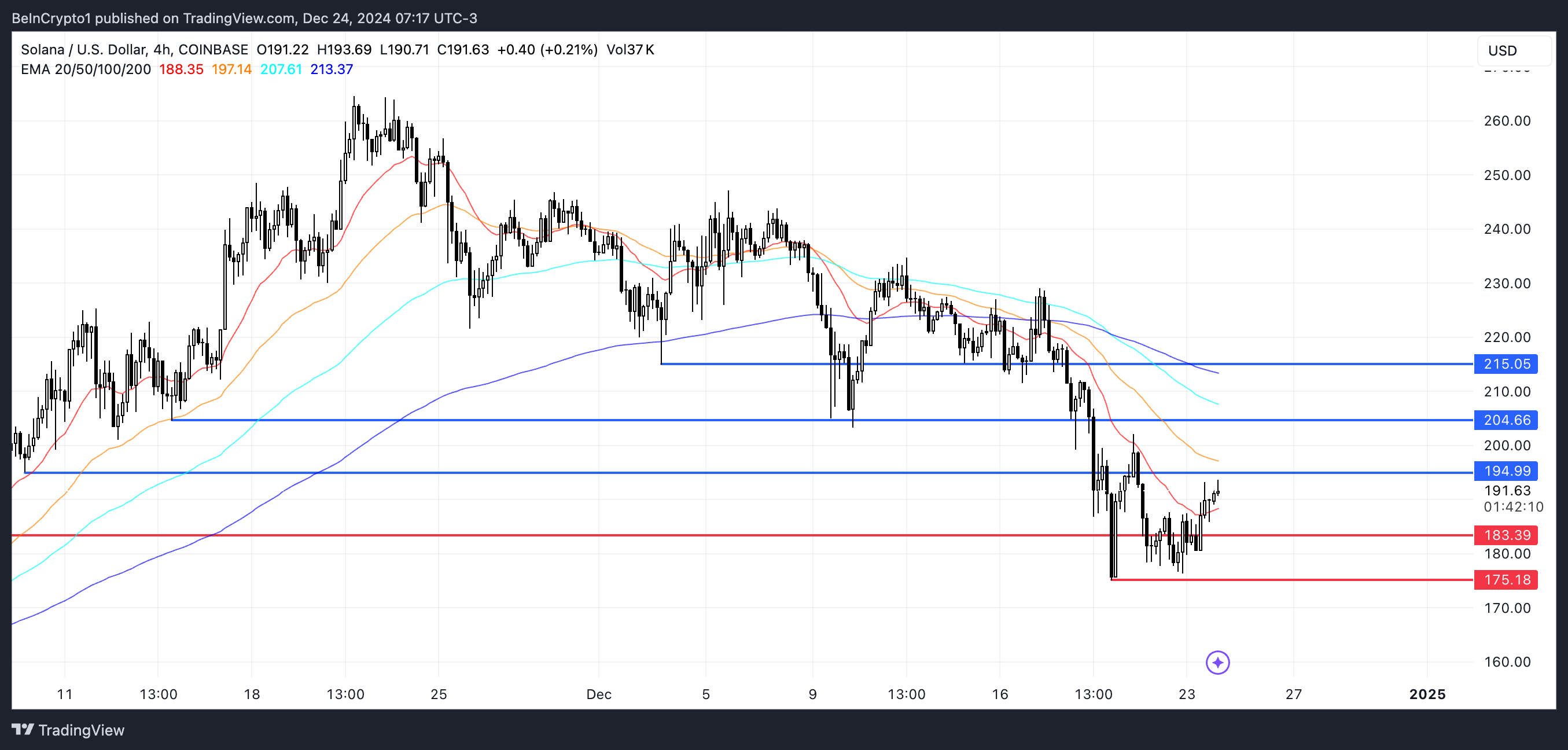 SOL koers dichtstbijzijnde weerstand rond $195 vormt een cruciaal niveau voor de komende koersbewegingen. Momenteel zijn de Exponential Moving Average (EMA) lijnen in een bearish configuratie, met kortetermijnlijnen onder de langetermijnlijnen.