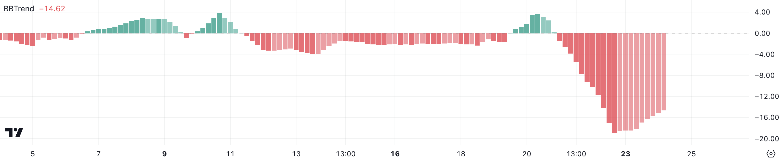 BBTrend, of Bollinger Band Trend, is een momentumindicator afgeleid van Bollinger Bands. Het meet het verschil tussen de koers van een asset en het middelpunt van zijn Bollinger Bands, en biedt inzicht in de sterkte en richting van de trend. Negatieve BBTrend-waarden duiden op bearish momentum, terwijl positieve waarden op bullish trends wijzen.