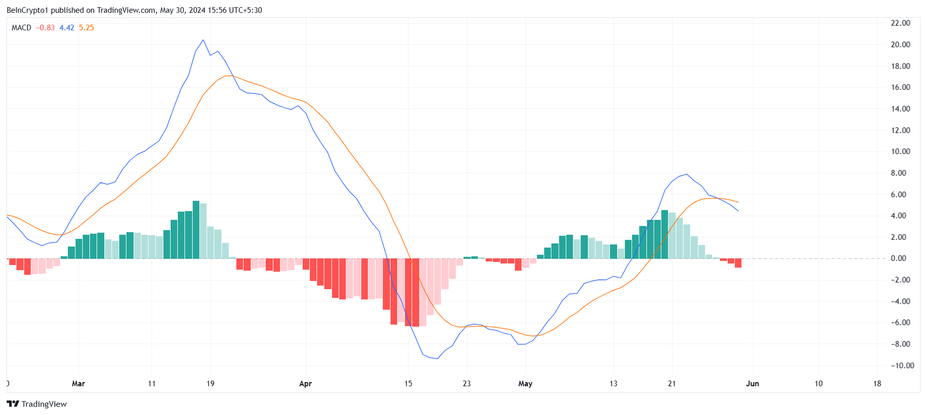 Op het moment van schrijven daalde de Solana koers naar $166, waarmee het onder de cruciale steun van $169 dook. Dit heeft de bearishness van de altcoin gestimuleerd, wat blijkt uit de Moving Average Convergence Divergence (MACD).