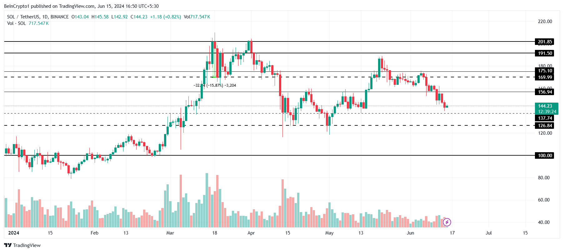 De Solana koers die wordt verhandeld op $144 zal waarschijnlijk verder dalen tot $137 als een steunbodem. Deze koers is in het verleden getest en markeert een maandelijkse low voor SOL. Als het scepticisme onder investeerders aanhoudt, zou de altcoin kunnen dalen naar $126.
