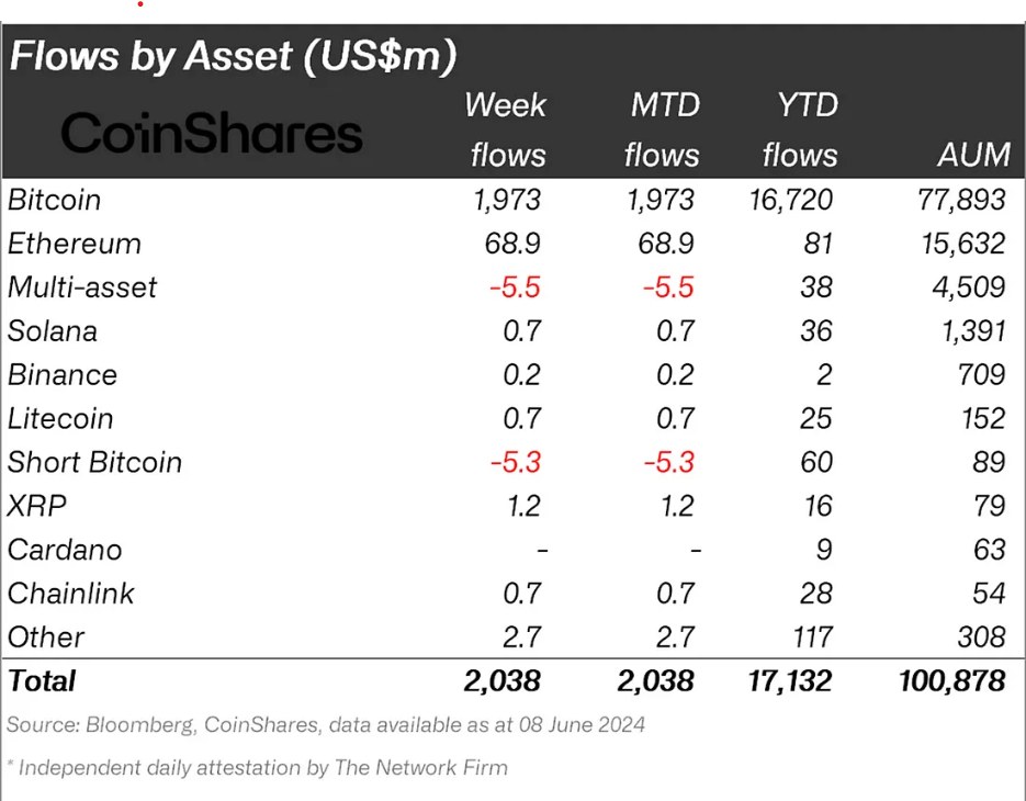 In de week die eindigde op 8 juni, waren alle drie de assets elk goed voor een instroom van ongeveer $0,7 miljoen. Hoewel dit geen deuk heeft geslagen in Solana’s positie als de asset met de hoogste instroom tot nu toe, wordt deze uitgedaagd. Ripple (XRP), aan de andere kant, heeft bijna $ 1,2 miljoen aan instroom gezien.