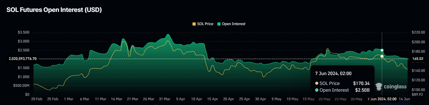 De verschuiving in het sentiment weerspiegelt de bredere onzekerheden en volatiliteit in de markt, waardoor Solana holders hun beleggingen voorzichtiger benaderen. In een week tijd is de OI met meer dan $500 miljoen gedaald van $2,5 miljard naar $2 miljard.