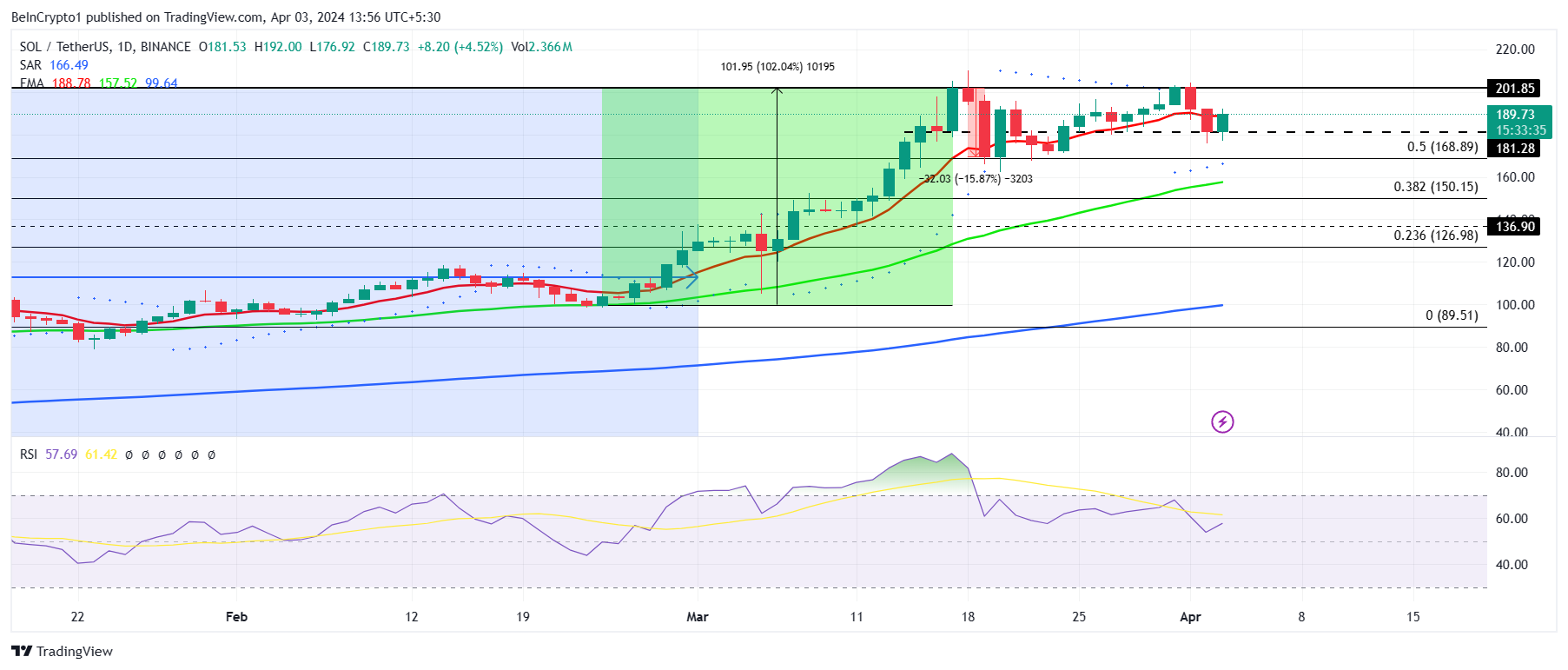 Op dit moment, nu Solana wordt verhandeld op $189 en boven het steunniveau van $181 blijft, probeert het het 50-daags Exponentieel Bewegend Gemiddelde (EMA) als steun terug te winnen. Maar zelfs met een nieuwe poging om de $200 barrière te overwinnen, is het waarschijnlijk dat SOL zal terugvallen naar $168.
