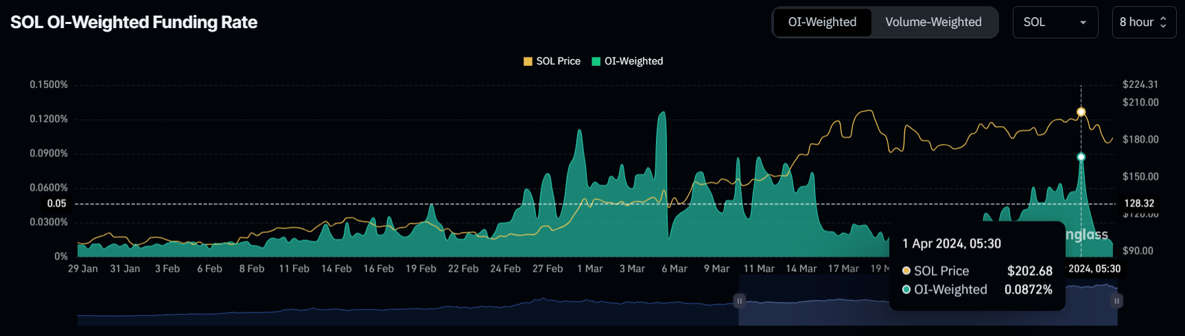 In twee dagen tijd daalde de OI van $3,14 miljard naar $2,88 miljard, een daling van 15%. Dit suggereert dat traders aarzelen om in te zetten op SOL, gezien de huidige periode van consolidatie.