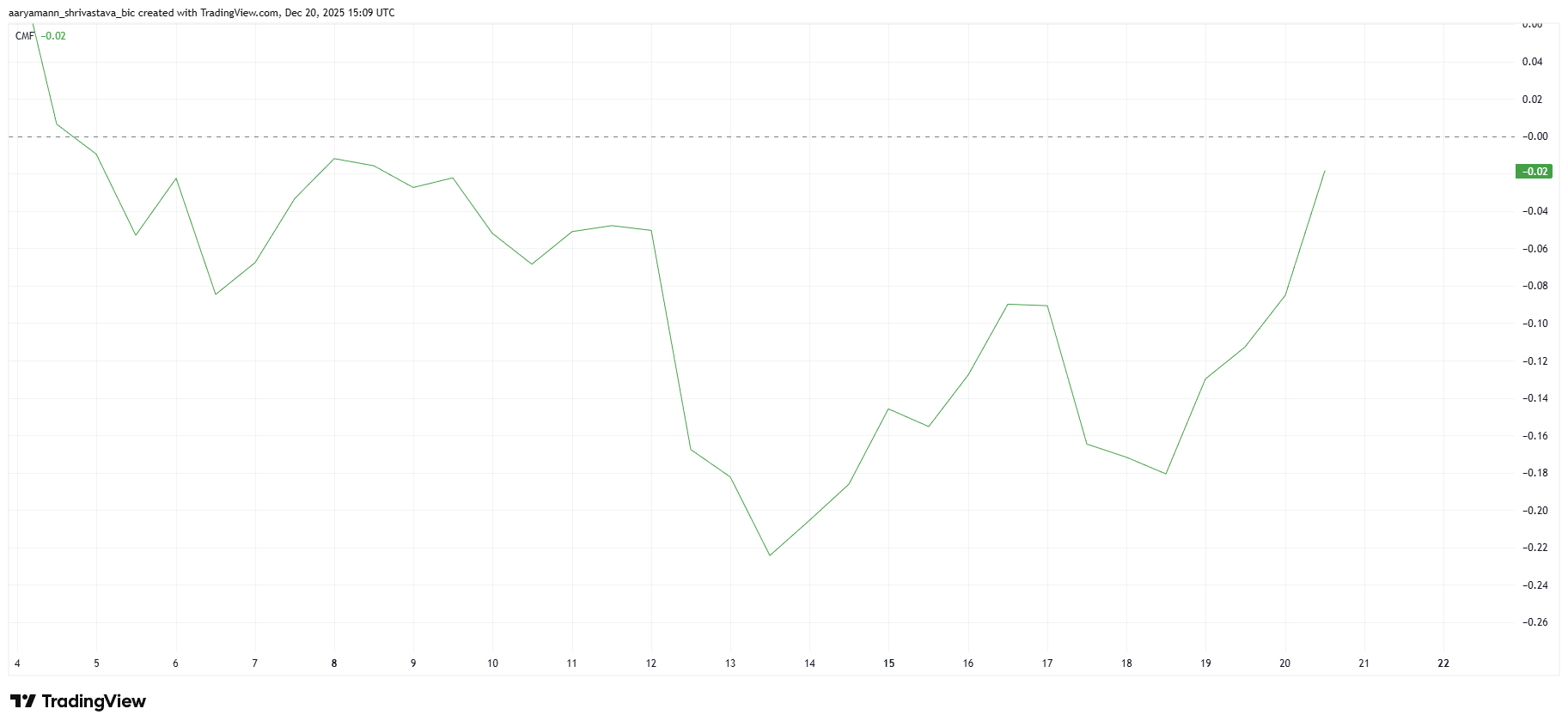 On-chain data wijzen op vroege tekenen van stabilisatie. De Chaikin Money Flow laat de afgelopen dagen een stevige stijging zien. Hoewel de indicator nog onder de nul-lijn staat, laat de opwaartse beweging zien dat de uitstroom van kapitaal afneemt.