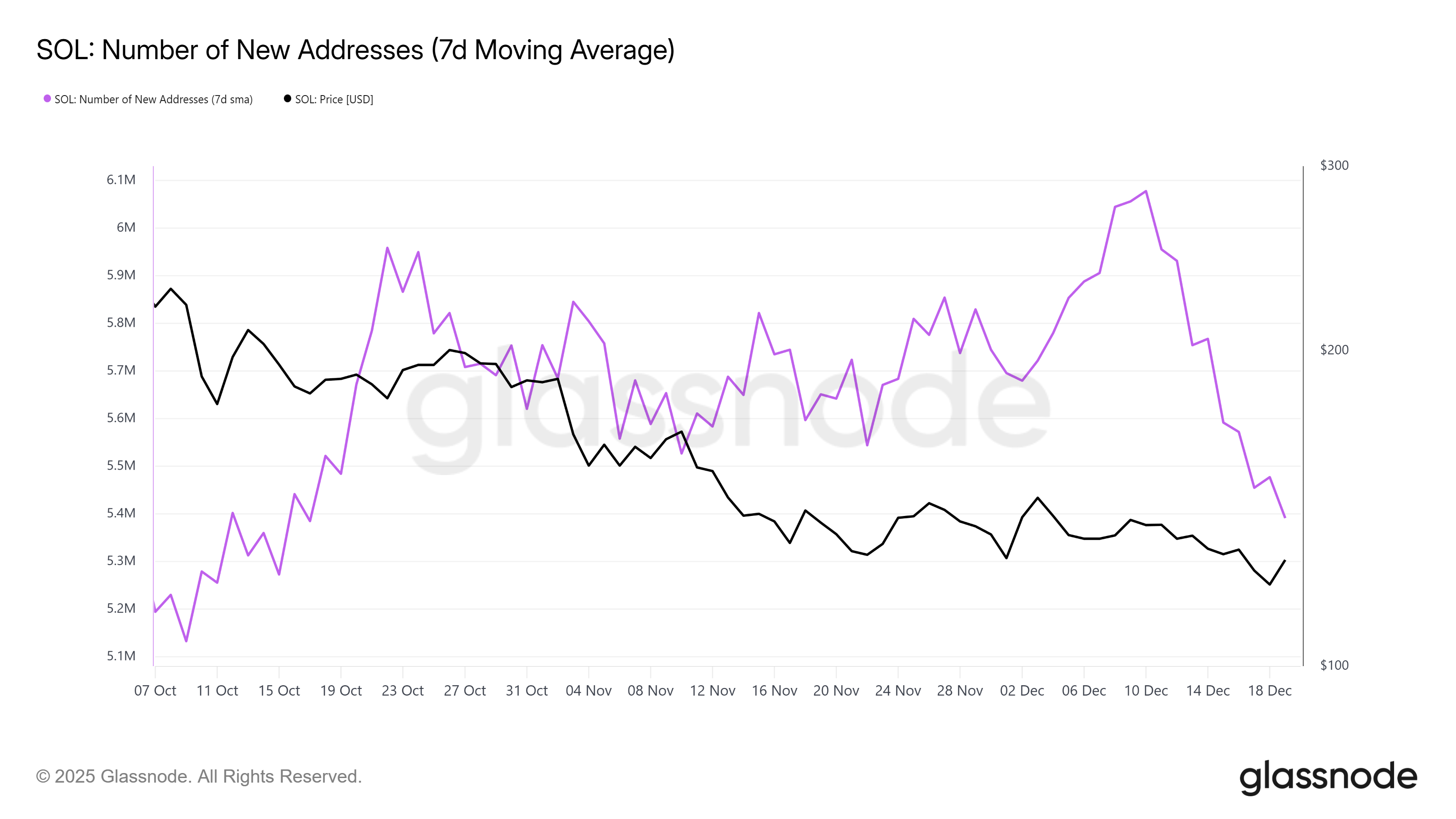 Macro-indicatoren laten een voorzichtiger beeld zien. Het aantal nieuwe Solana-adressen is de afgelopen dagen flink gedaald. Nieuwe adressen daalden van 6.077.000 naar 5.390.000, een afname van 11,3% in tien dagen.