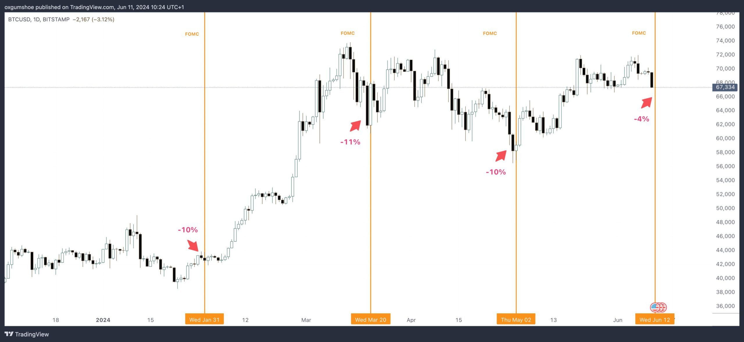 “Er zijn 4 FOMC [vergaderingen] geweest in 2024. [BTC dumpte 10% in de 48 uur voor al deze bijeenkomsten. Op FOMC-dag herstelde het de hele beweging. De markt koerst altijd op overdreven bearish uitspraken en keert dan om,” schetste Gumshoe.